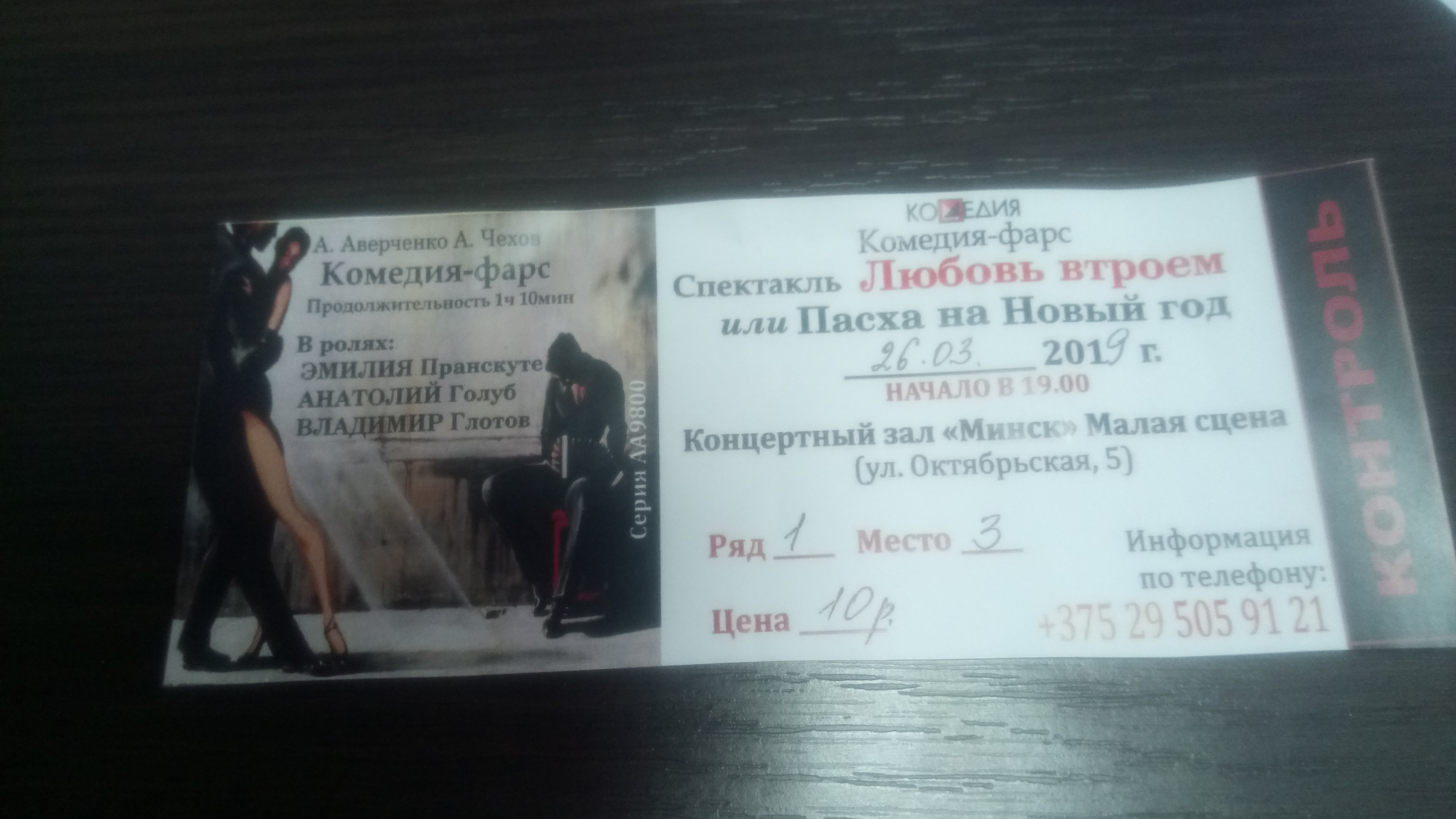 - Спектакль "Любовь втроем или Пасха на Новый год" состоится 26 марта 2021 г. в 19:00 в гостинице "Беларусь" (большой конференц-зал)