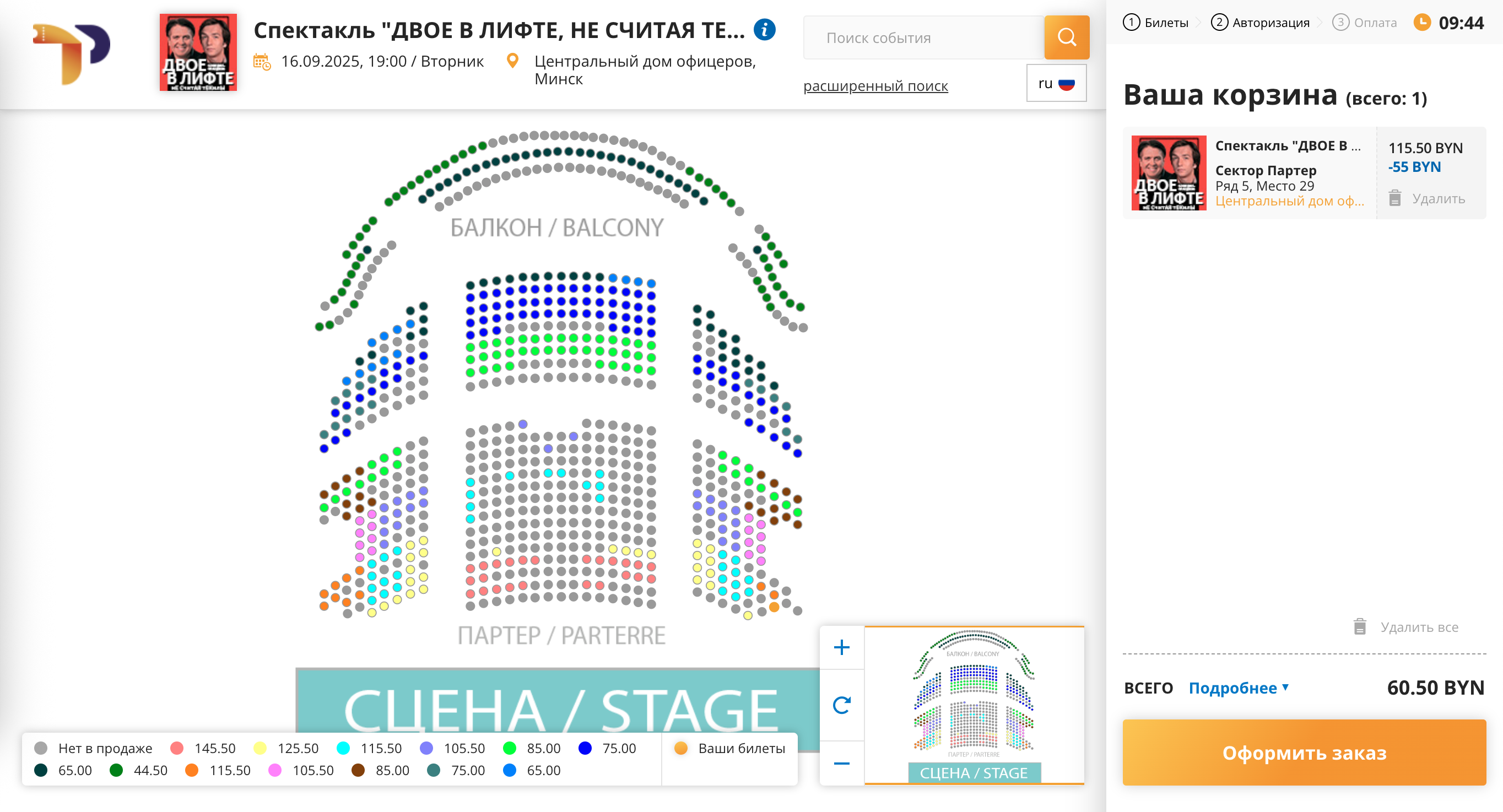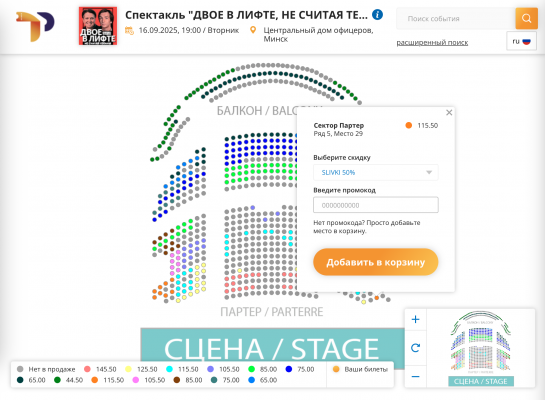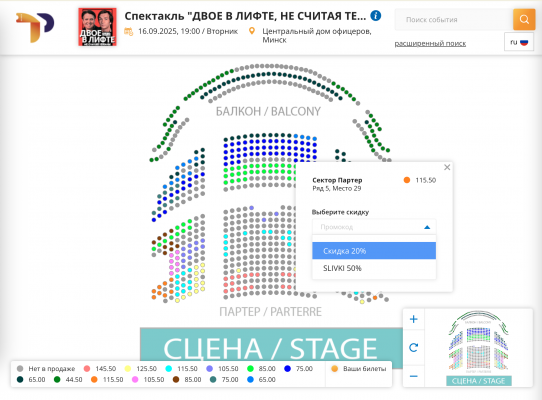 Добрый день! Проверили информацию, все работает корректно. Обращаем Ваше внимание, что не все места попадают под акцию, а только указанные на сайте Slivki.by. На скриншотах ниже подробно покажем как приобрести билет по акции:
