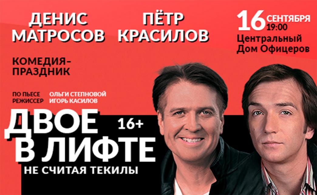 - Спектакль "Двое в лифте, не считая текилы" 16+ состоится 16 сентября в Центральном Доме офицеров