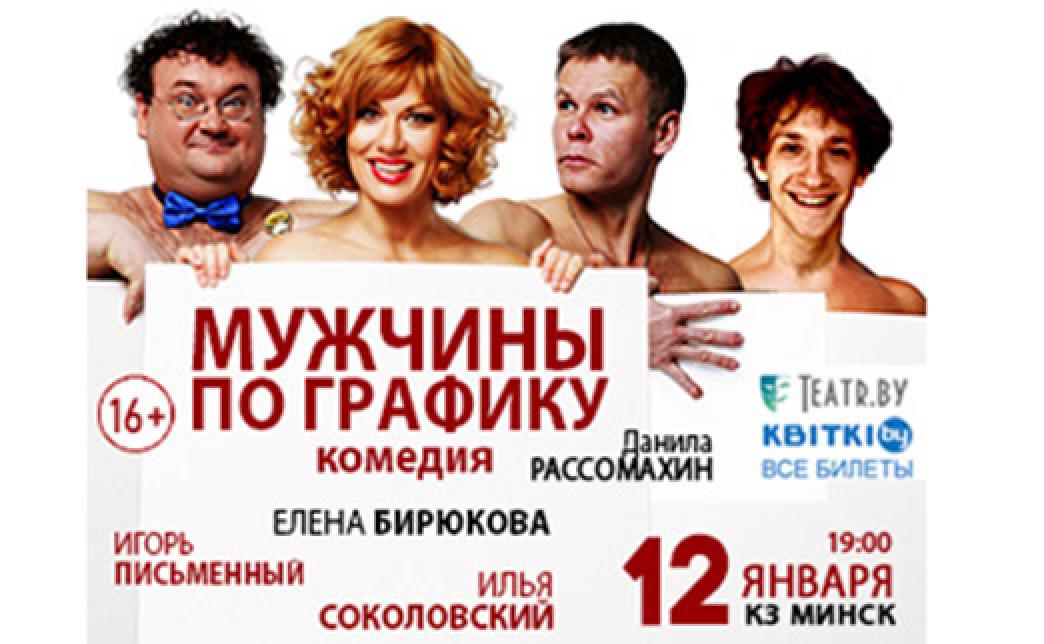- Спектакль "Мужчины по графику" состоится 12 января в 19:00 в КЗ "Минск" (ул. Октябрьская, д. 5).