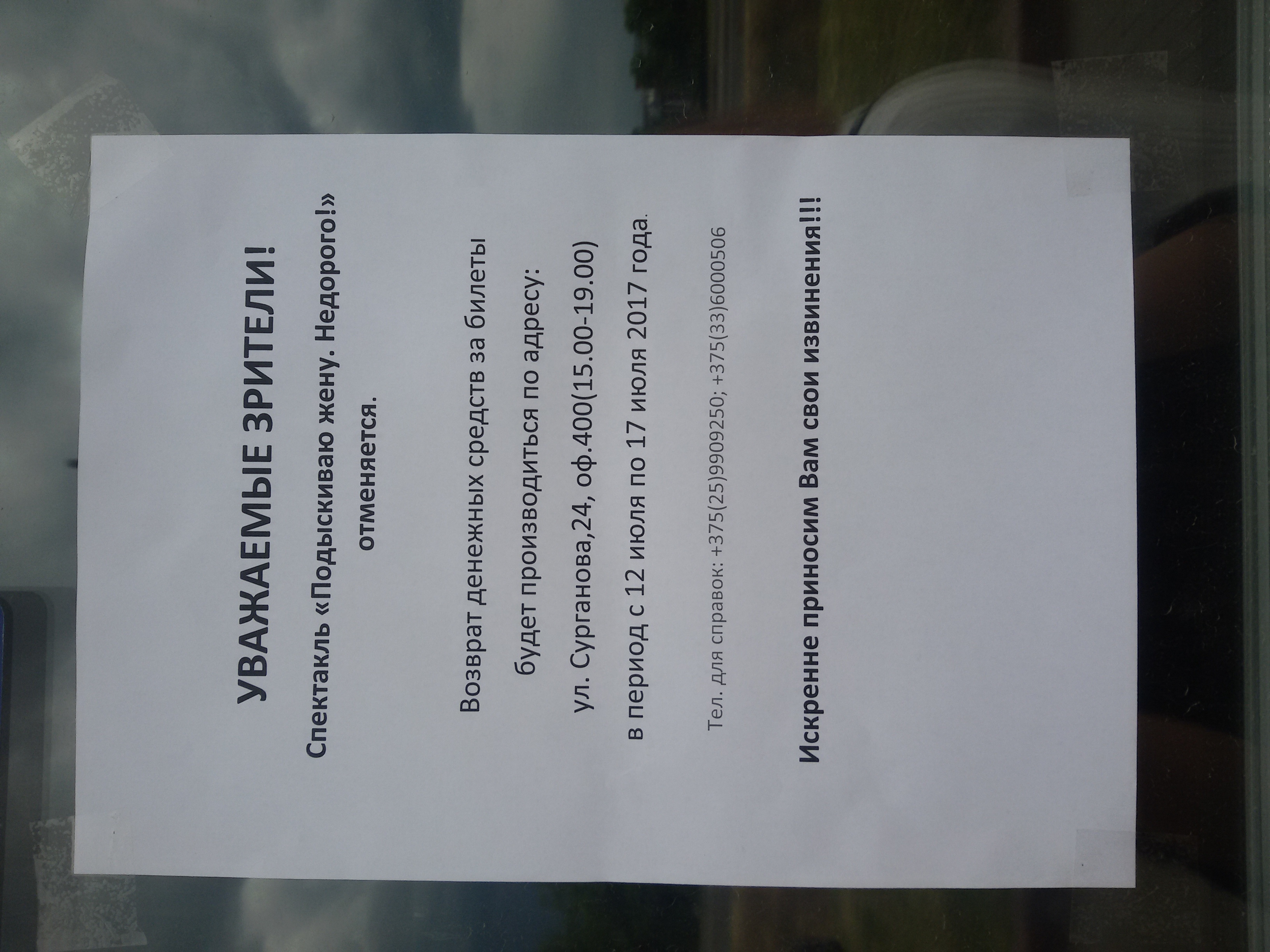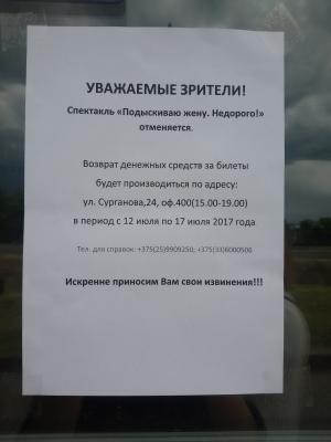 - Спектакль отменен. Возврат денежных средств зрителям, которые приобрели билеты будет производиться с 12 июля по 17 июля. Справки по тел.: (033) 600-05-06. Приносим свои извинения за доставленные неудобства.