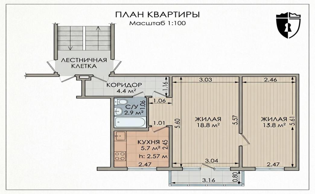 • Общая площадь: 45.6 м²