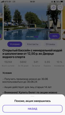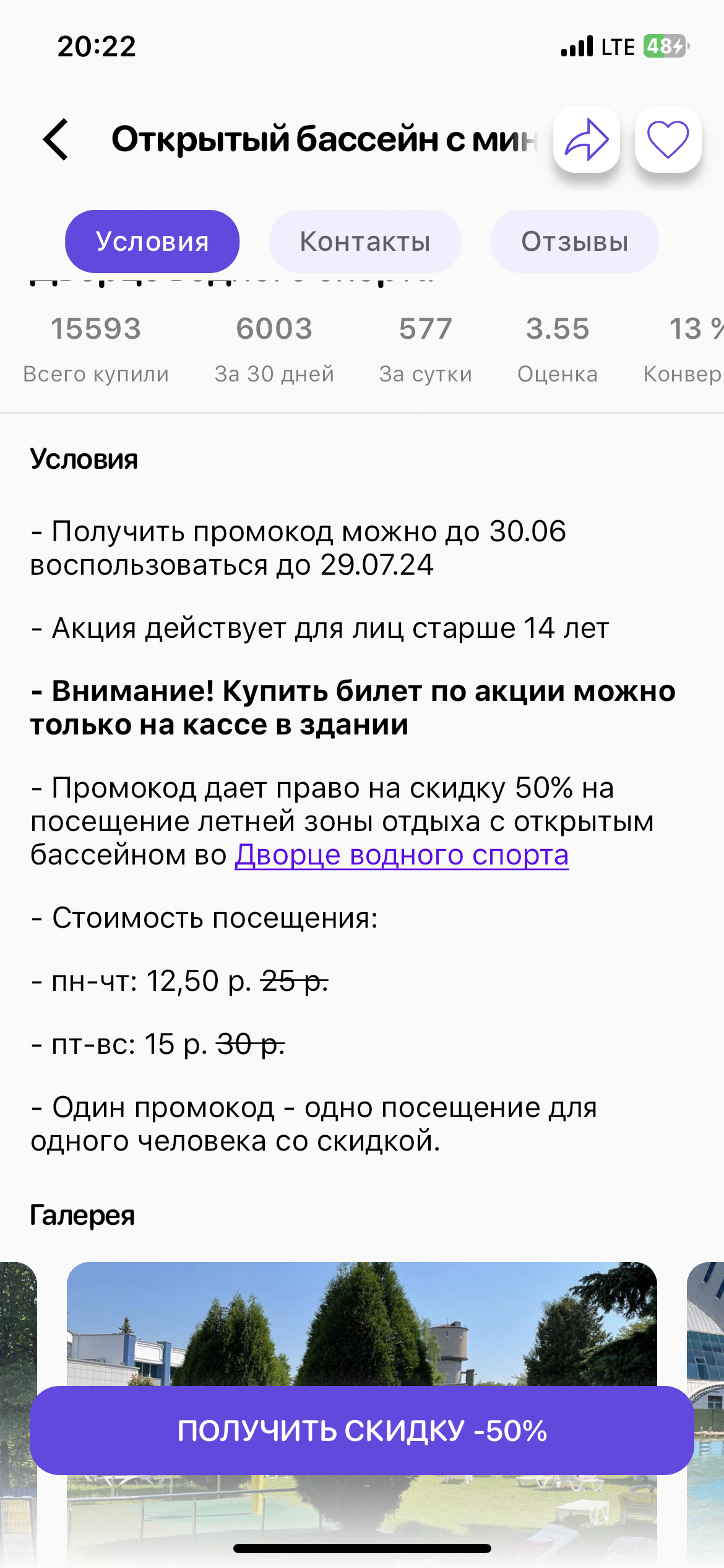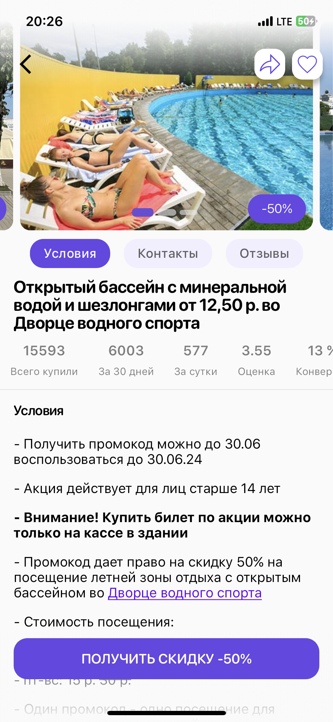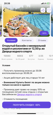 - Промокод дает право на скидку 50% на посещение летней зоны отдыха с открытым бассейном во Дворце водного спорта
