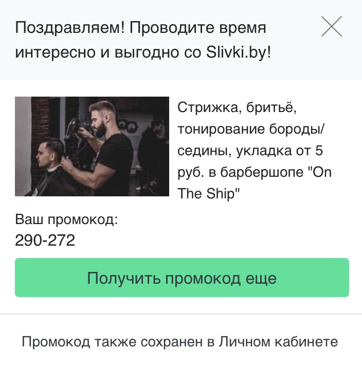 - Промокод дает право на скидку до 67% на стрижку, бритье, укладку в барбершопе "On The Ship"