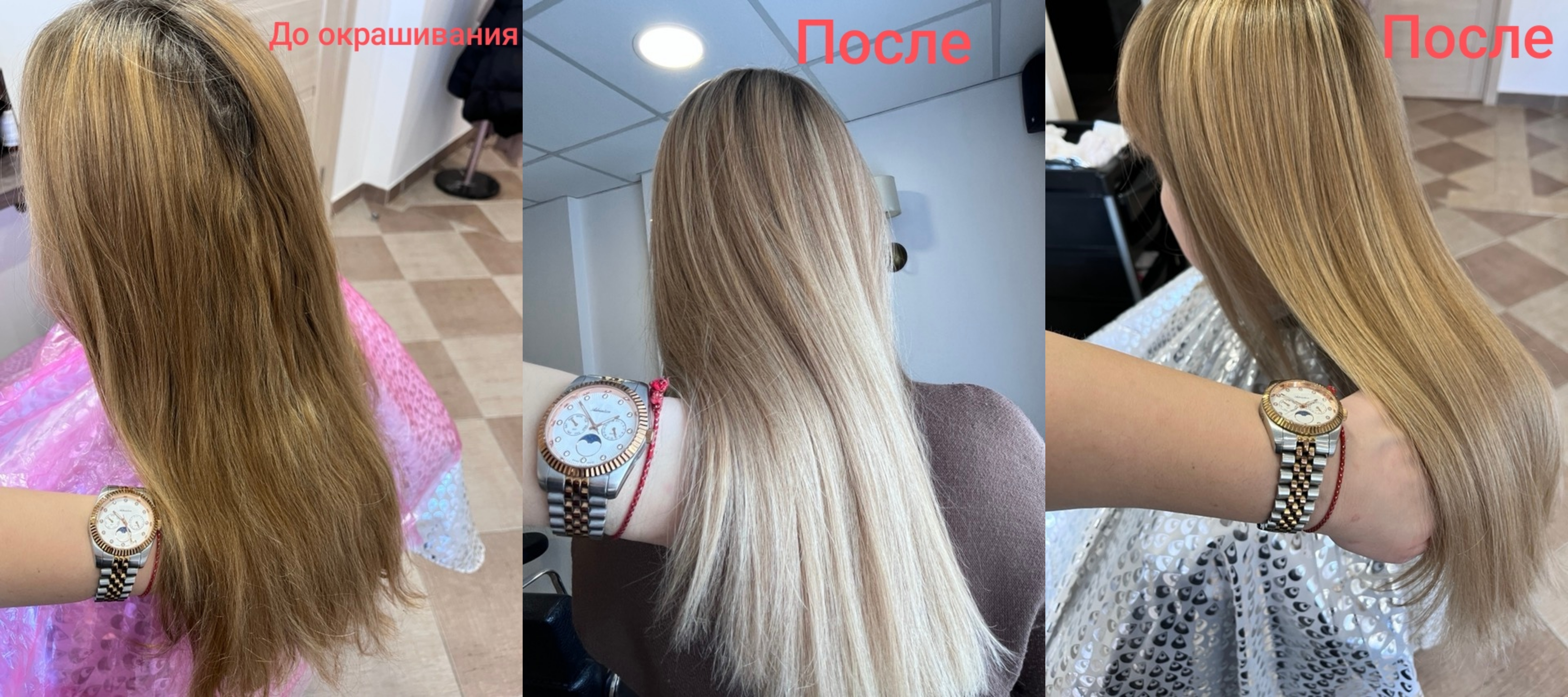 - В стоимость окрашивания входит краситель, мытье головы с мгновенным уходом, сушка по форме