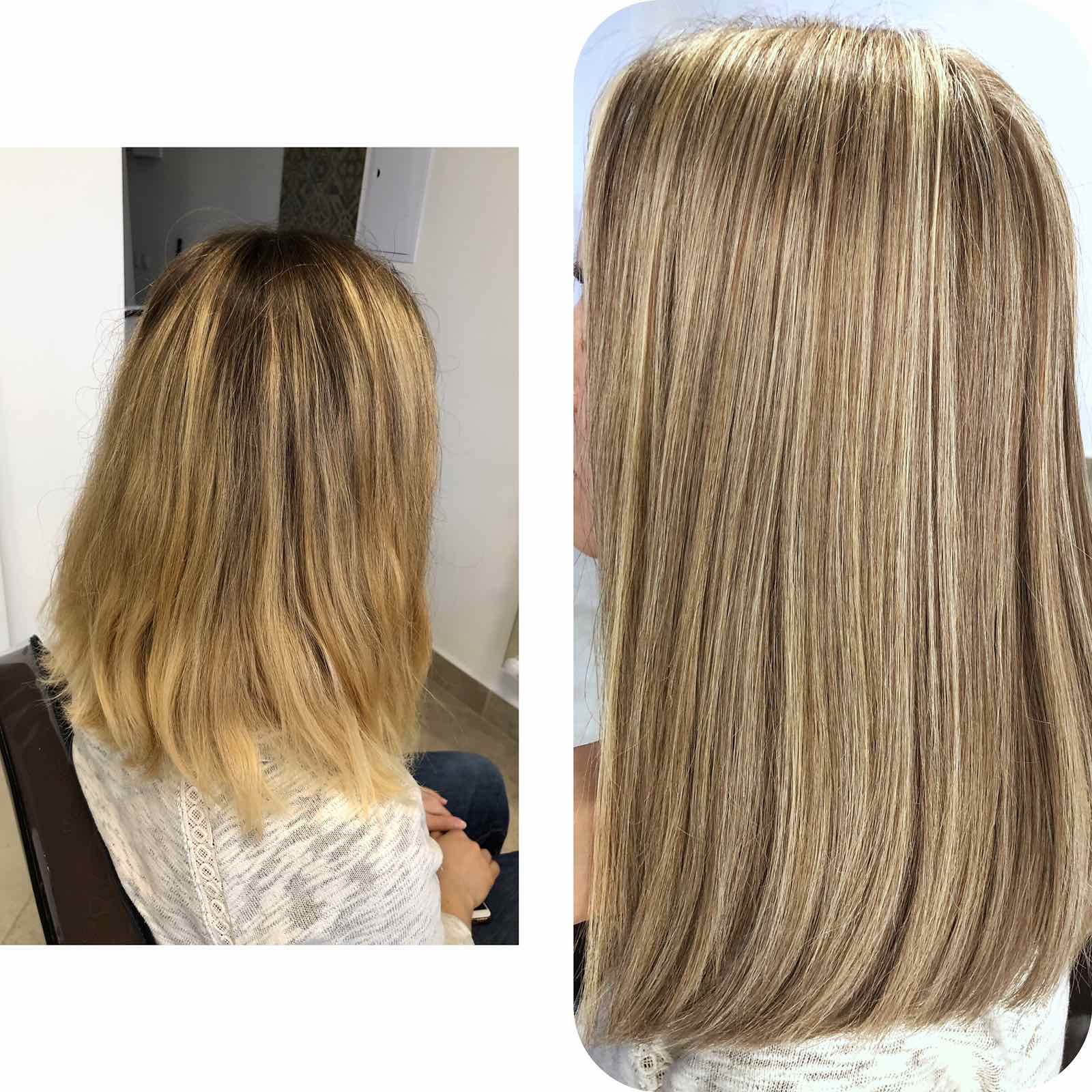 При поврежденных или тонких волосах используется техника осветление прядей на верхне-затылочной, теменной и боковых зонах,что дает эффект оставаться визуально светлой, сохраняя качество волос и нет необходимости дополнительно тонировать волосы в домашних условиях. Остальные волосы прокрашиваются натуральным цветом (краской, которая напитывает волос, увлажняя его, что придает плотность волосам и блеск).