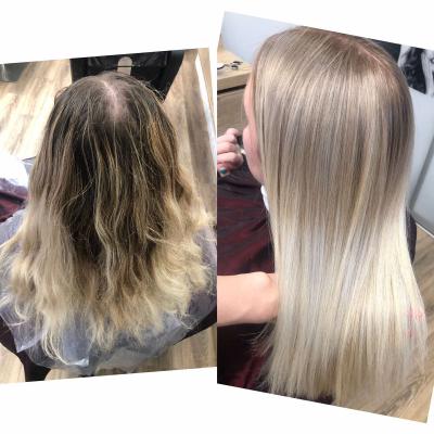 Подойдет для блондинок у которых осветленный волос,пятнами по всей длине за счет разных нанесений красителей, возможно бытовых в домашних условий или ровный цвет по длине с отросшими корнем.