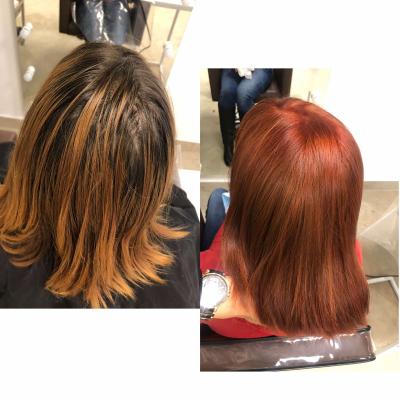 Результат такого окрашивания возможен с 1 или 2, 3 раз в зависимости от качества и структуры волоса, самого цвета по всей длине (пятнами цвет лежит, либо ровный по всей длине, многое зависит от нанесения предыдущих окрасок,были ли они сделаны профессионально или в домашних условиях и краситель бытовой или профессиональный).