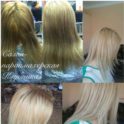 Здравствуйте!После" смывки "волос становится пористый,цвет может получиться не такой насыщенный как на фото,но близко к этому.Окрашивание на длинный волос выйдет около 45 рублей.Можете прийти на консультацию,мастер Вам даст подробную консультацию.