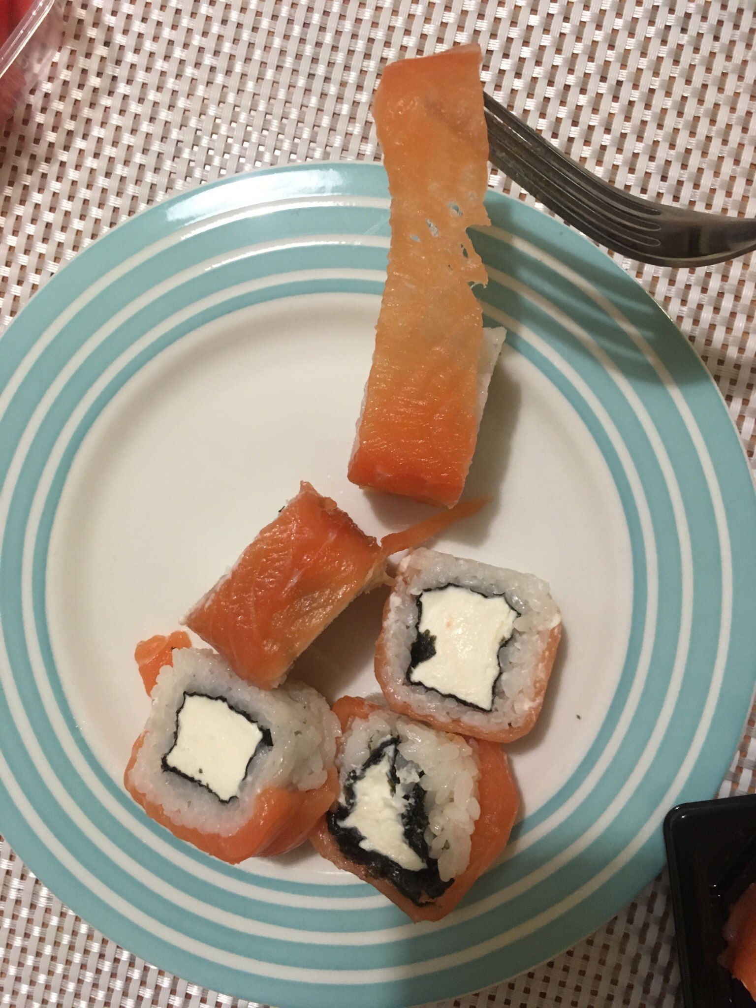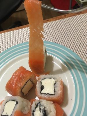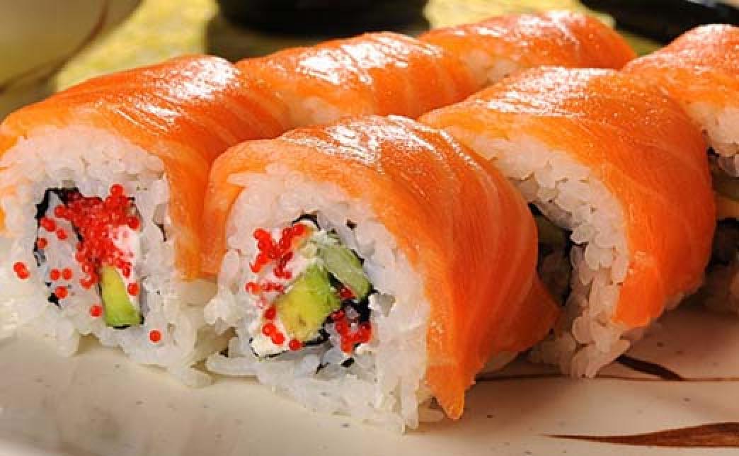 Ролл с жареным лососем и авокадо (225 г) (жареный лосось, авокадо, стружка тунца, сыр, рис, нори)