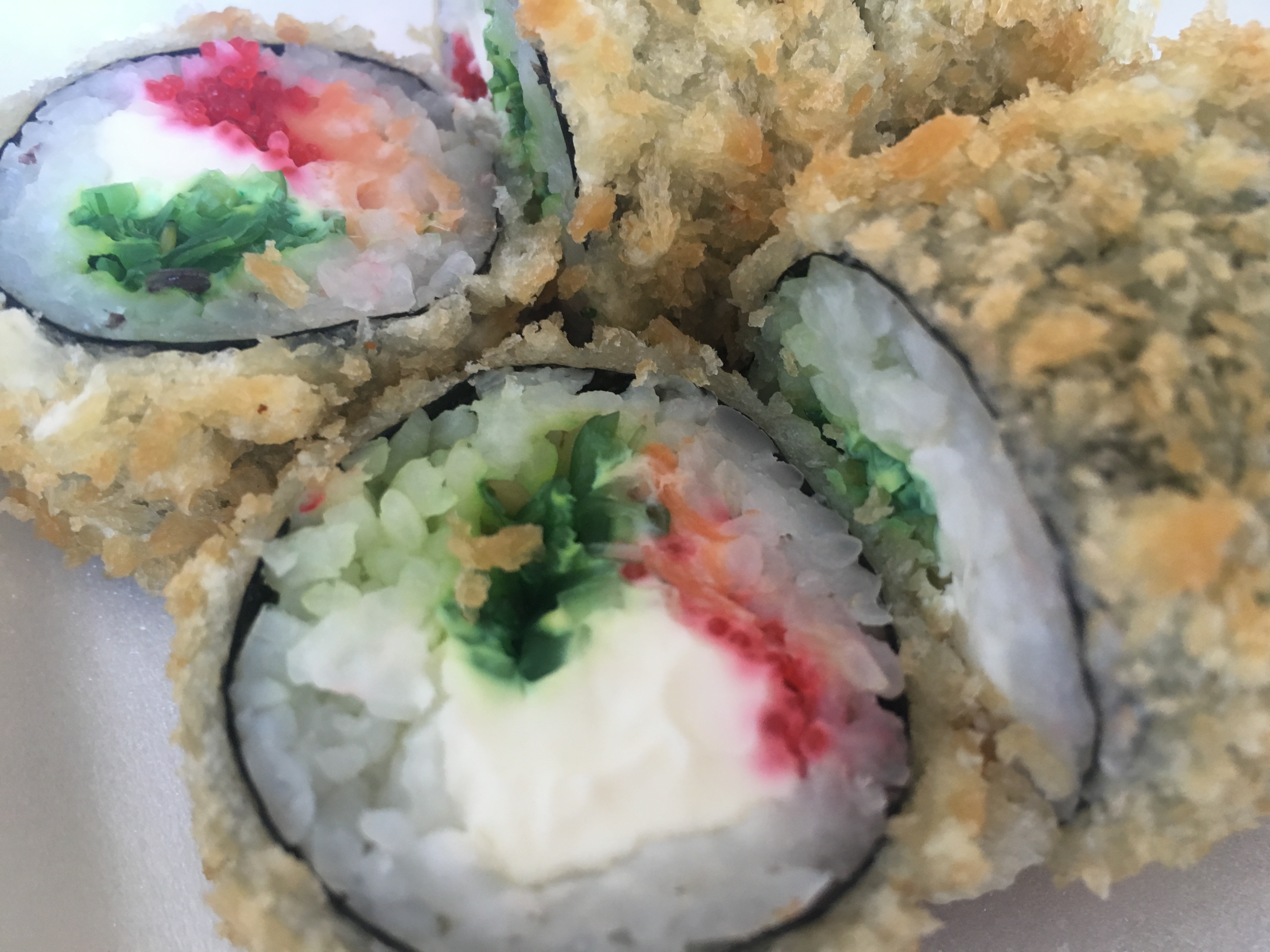 (окунь в кляре, огурец, икра тобико, соус, сыр, рис, нори)