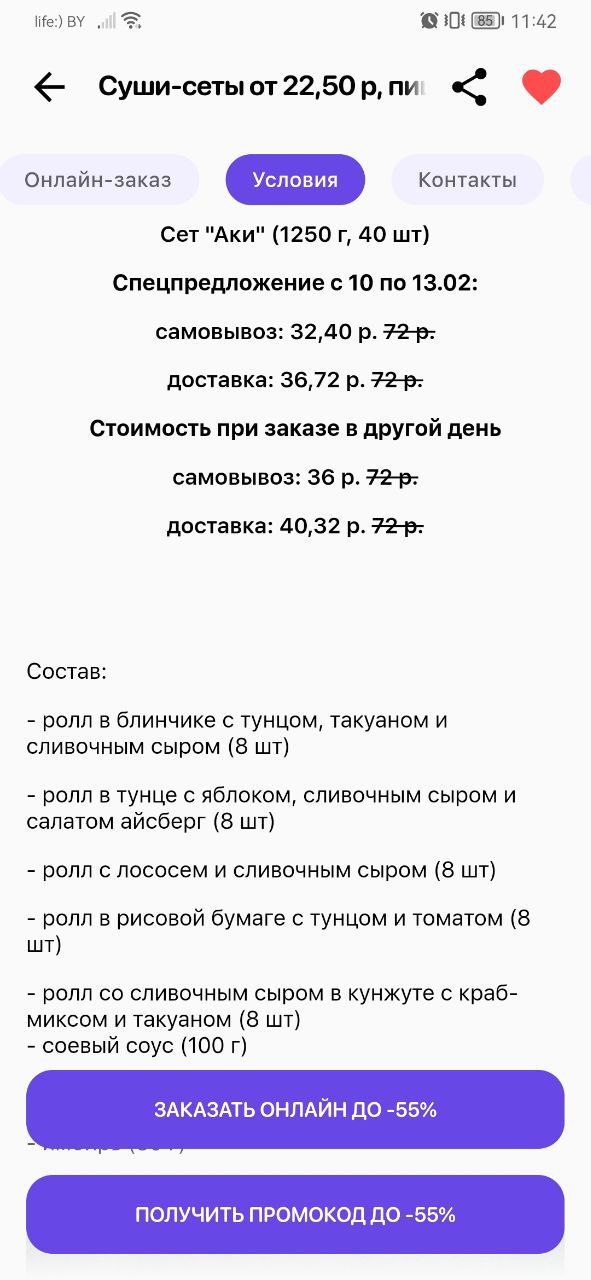 - Промокод дает право на скидку до 60% на суши-сеты от "ART FOOD"
