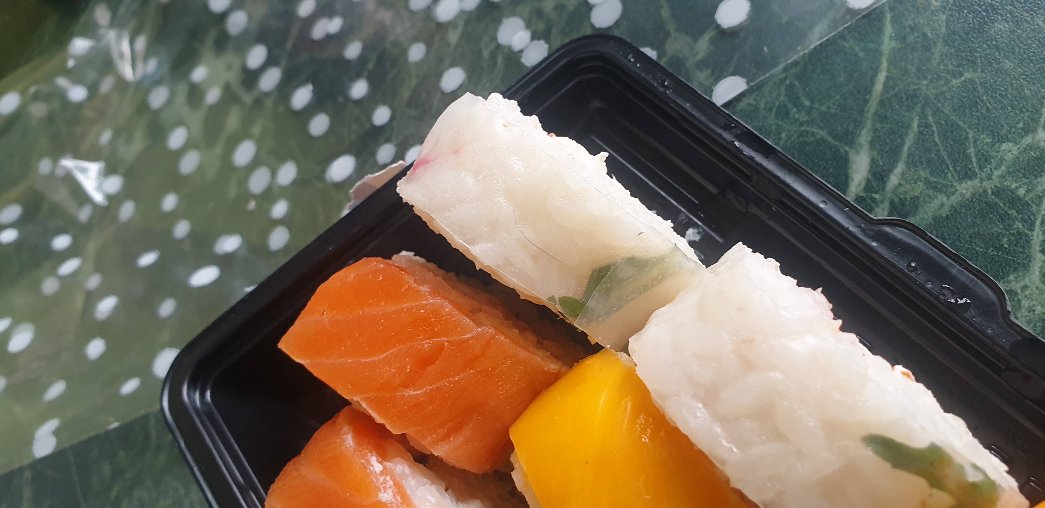 половина роллов кривые, разваливаются, некоторые попадаются практически без начинки, но это все можно было бы стерпеть, если бы не волос под рисовой бумагой....
