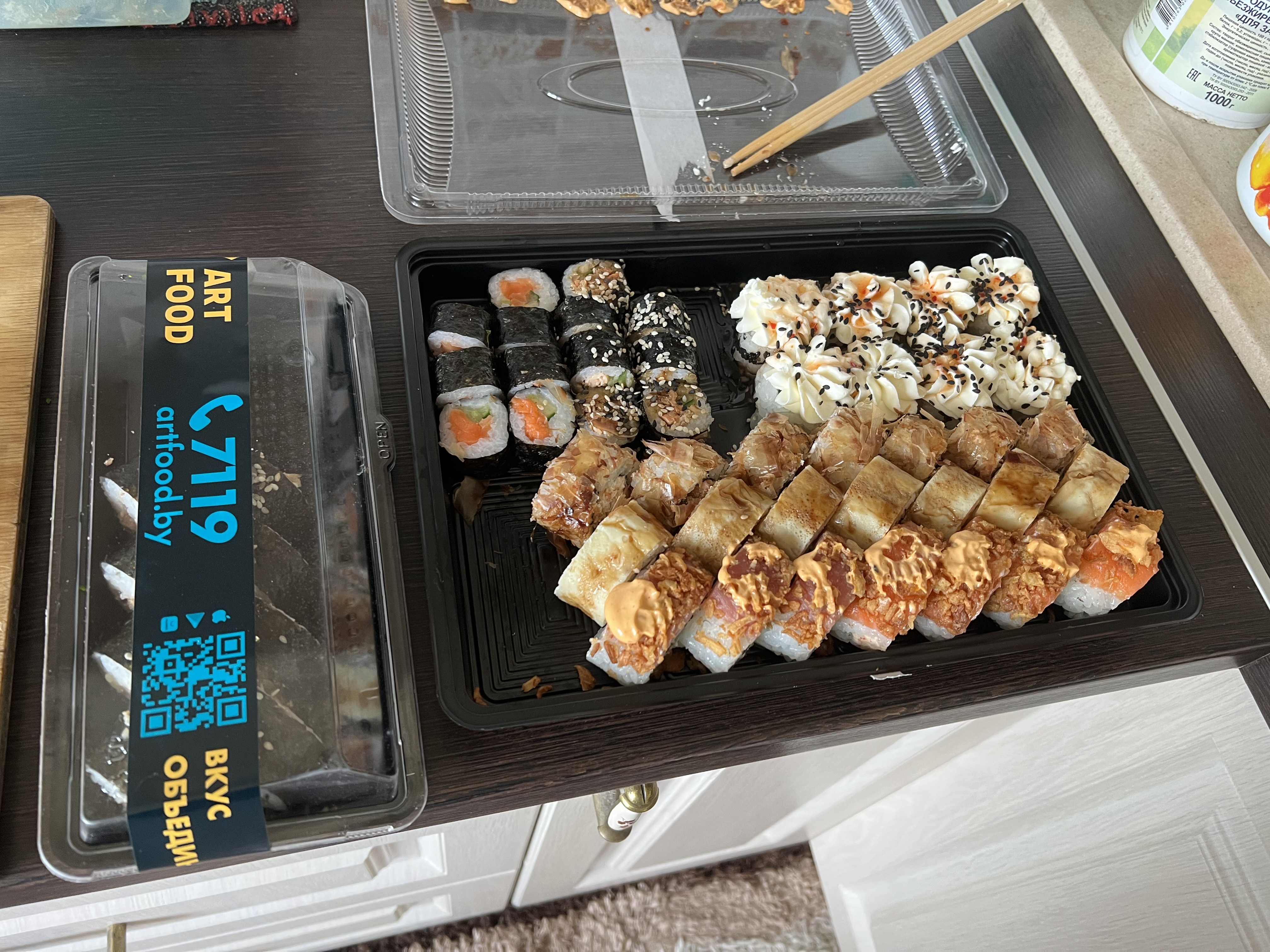 - Внимание! 01.01.2026 прием заказов осуществляется с 14:00 до 23:00. Доставка с 15:00 до 23:00. Вынос и посадка в ресторане с 15:00 до 23:00 по адресам: ул. Притыцкого, 93 и ул. Свердлова, 32.
