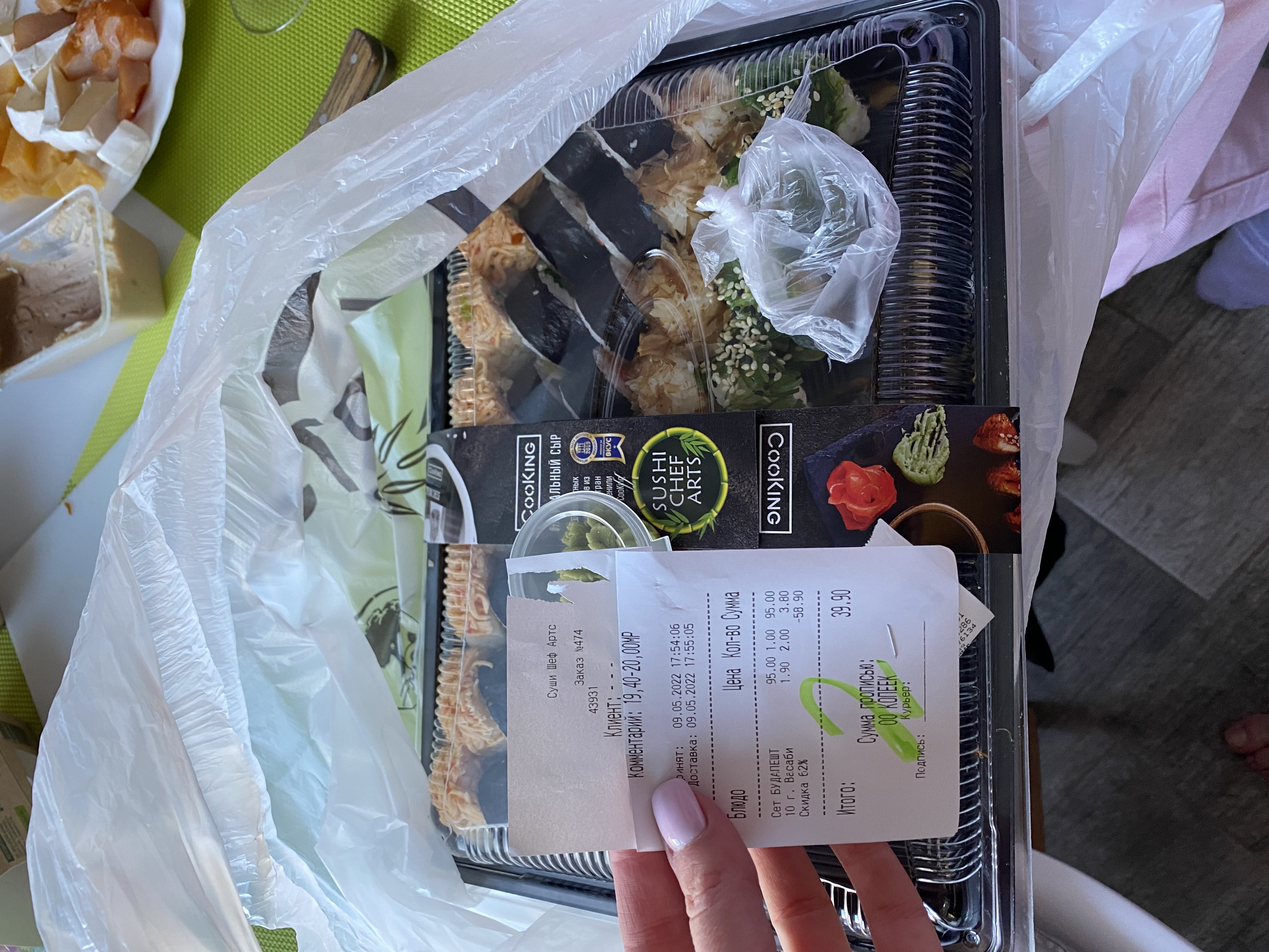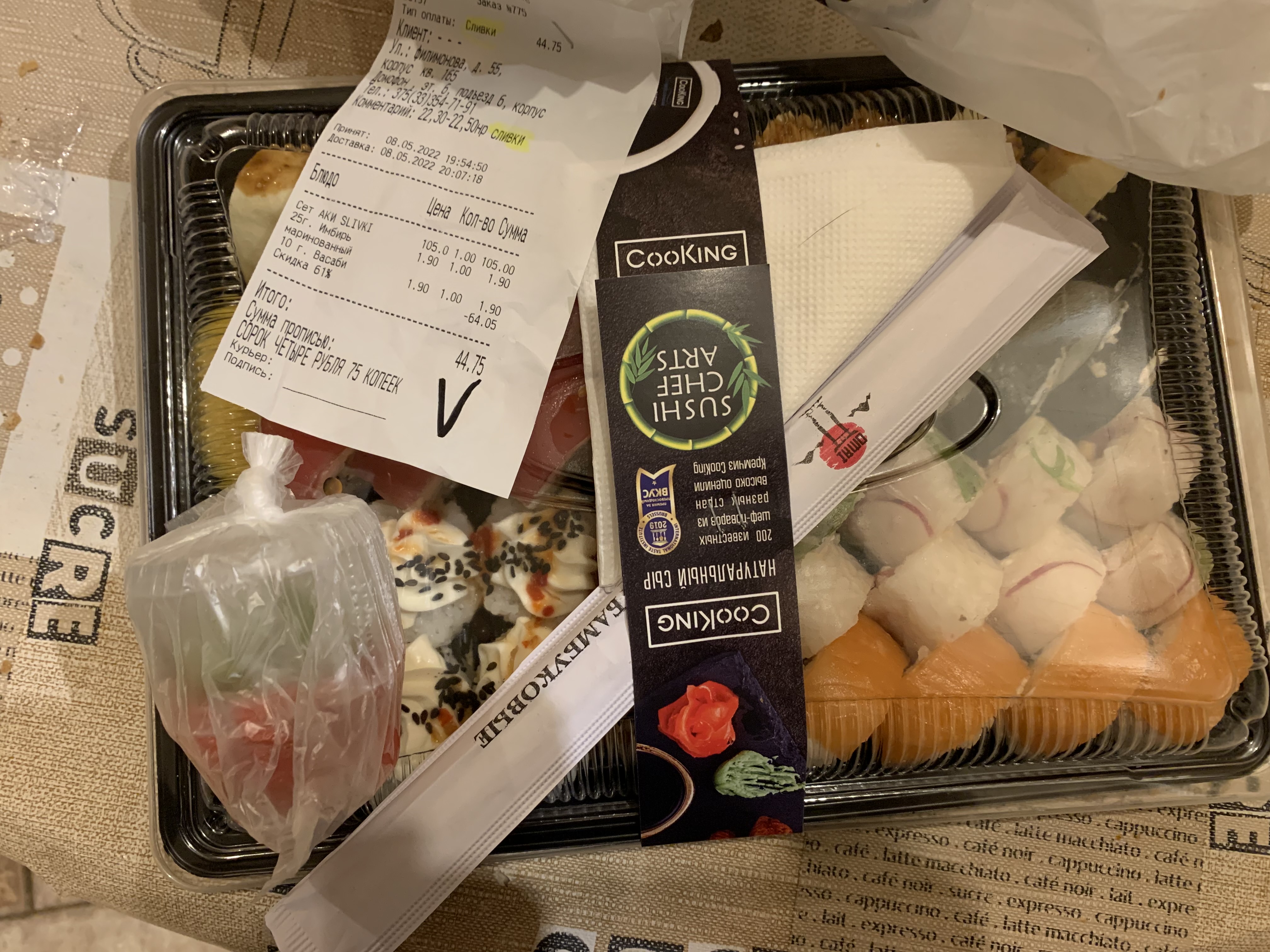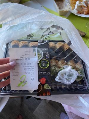 Заказали сет аки в 19.50, сделали доставку на 22.30. Суши привезли в 00.10 и не отвечали на звонки. Суши выглядели ужасно, как будто их приготовили вчера и были безвкусные. Рис был сухой и рыба плохо пахла. Также в заказе мы прописали: 1 васаби, 3 имбиря, убрали палочки. В пришедшем чеке все было изменено. И оплатили мы 47,70р, а в заказе который привезли 44,75! Не советую!