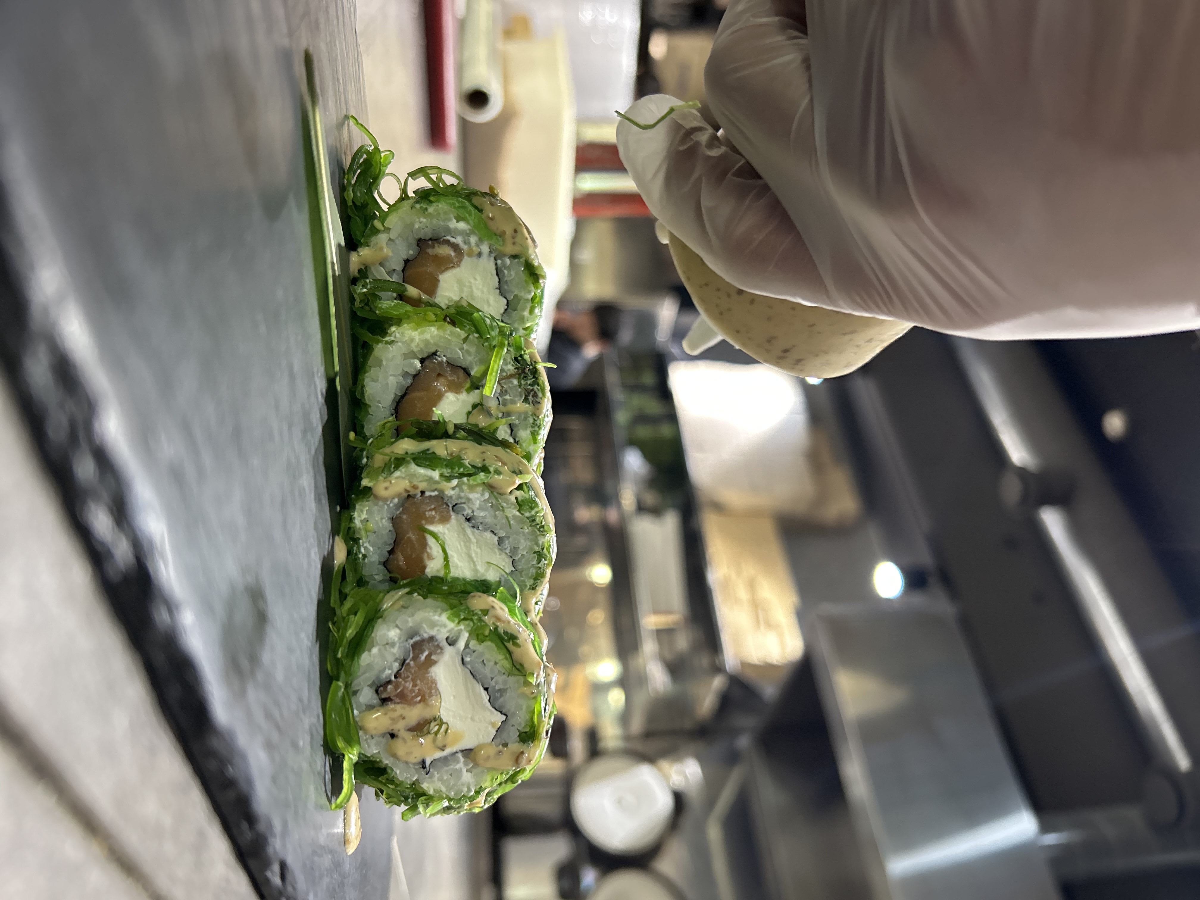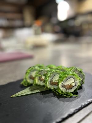 На фотографии представлен ролл Грин. Прекрасное сочетание в виде лосося, чука салата и нежного творожного сыра.