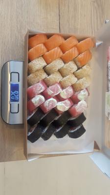 Зачем делать акцию, если к заказам по сливкам так относятся? В очередной раз недовес, сет должен весить 970, с коробкой весят 912, примерно недовес в 2шт суши. И насколько я знаю, то сверху не должны класть составные куски, такие должны идти в начинку. Все видно на фото