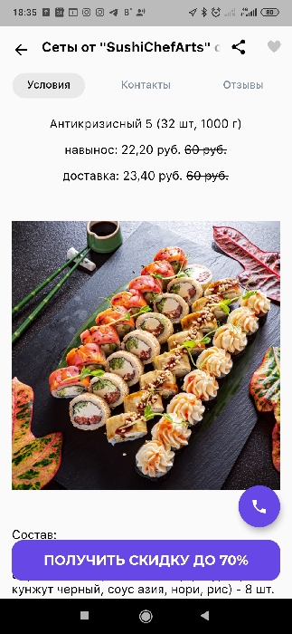 - Промокод дает право на скидку до 60% на суши-сеты от "ART FOOD"