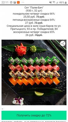 - Промокод дает право на скидку до 60% на суши-сеты от "ART FOOD"