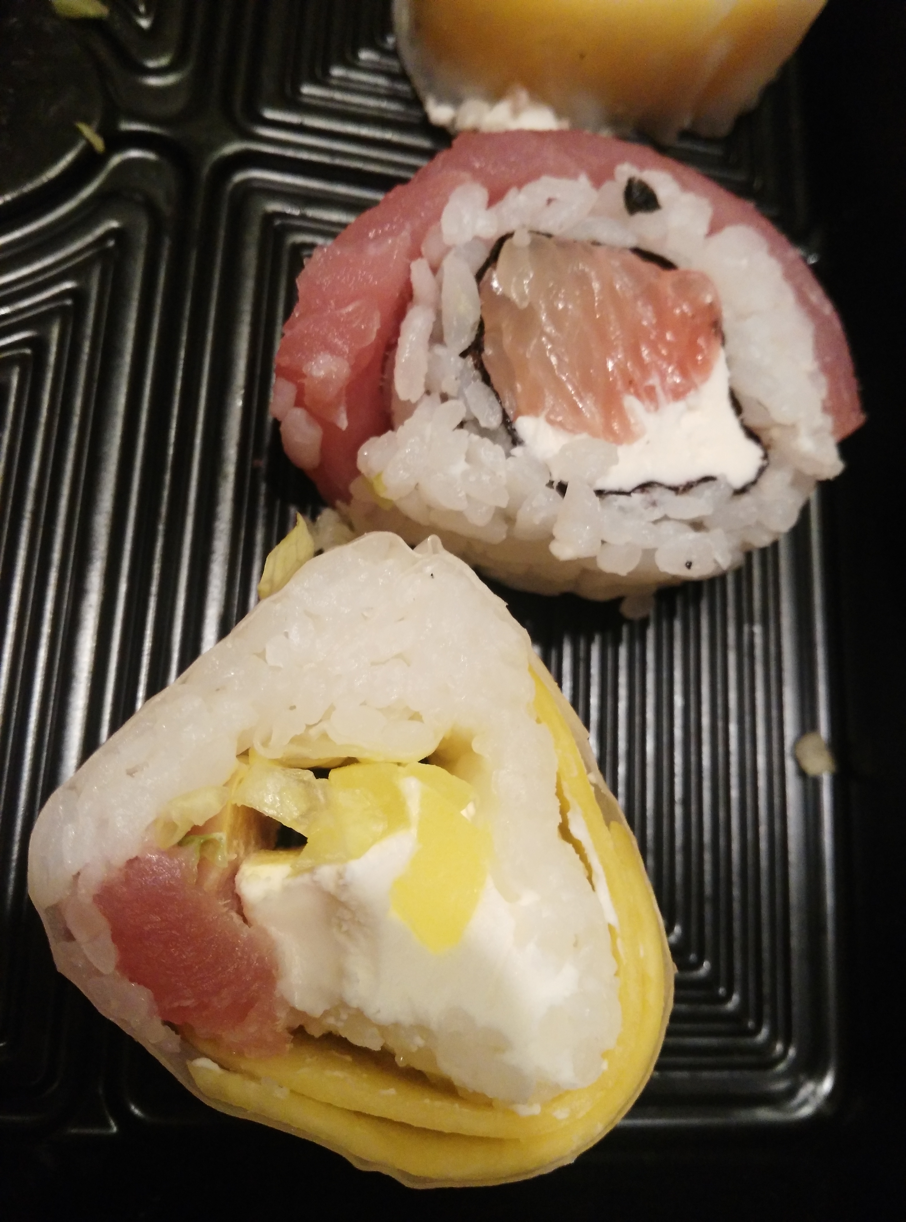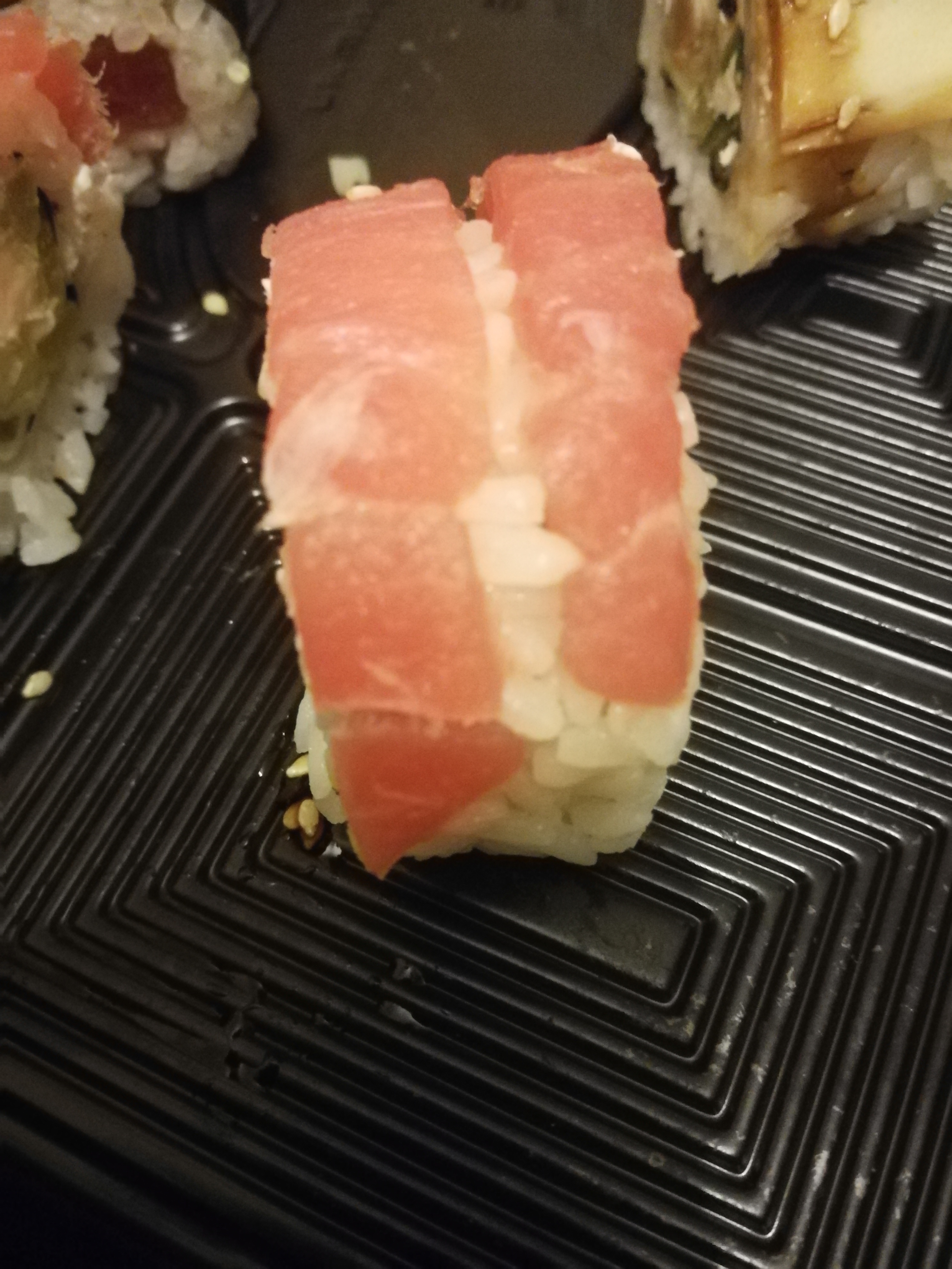 3. Внешний вид некоторых роллов оставляет желать лучшего. Пример показан на фото. Это словно из остатков рыбы решили сделать ролл, не выкидывать же. Отдадим клиенту так.