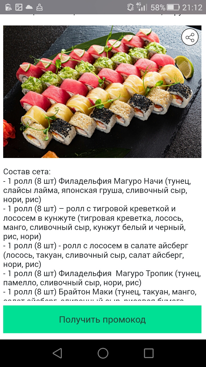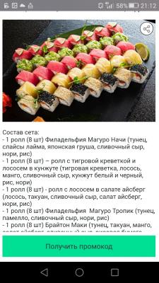 - Промокод дает право на скидку до 60% на суши-сеты от "ART FOOD"