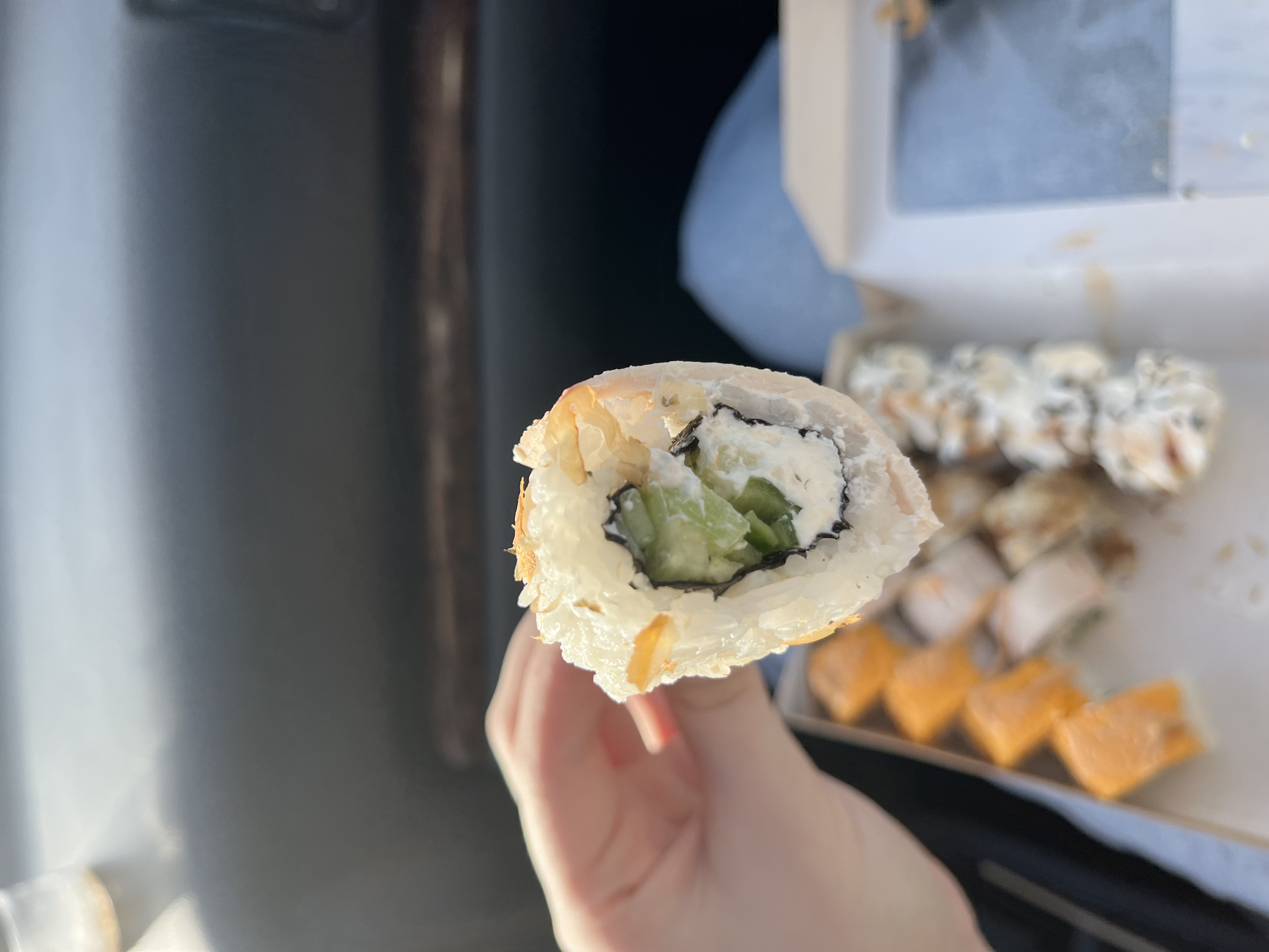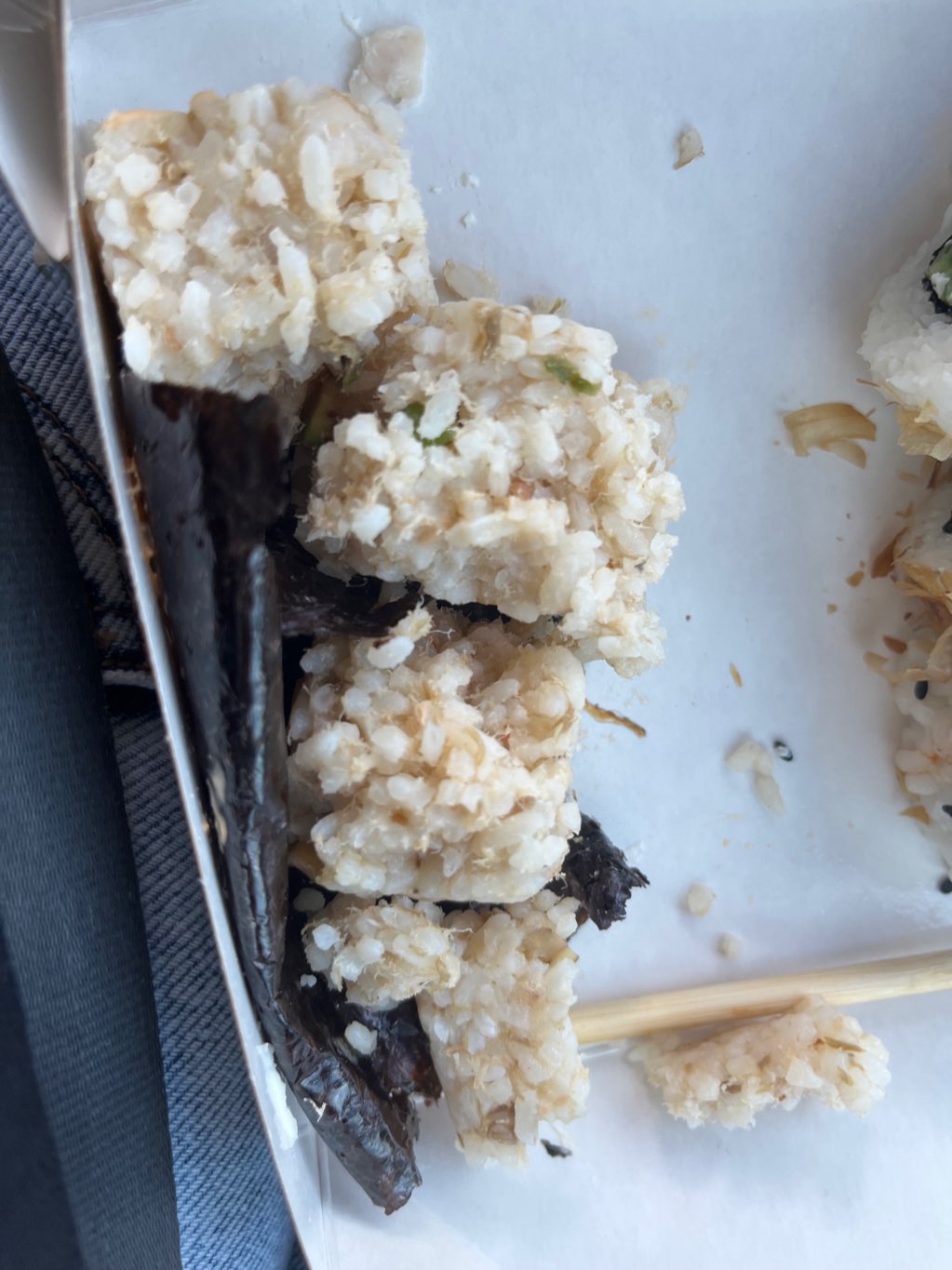 Онигири невозможно есть и конечно же без рыбы(заявлено с лососем). Просто сухой слипшийся рис и пару кусочков авокадо.