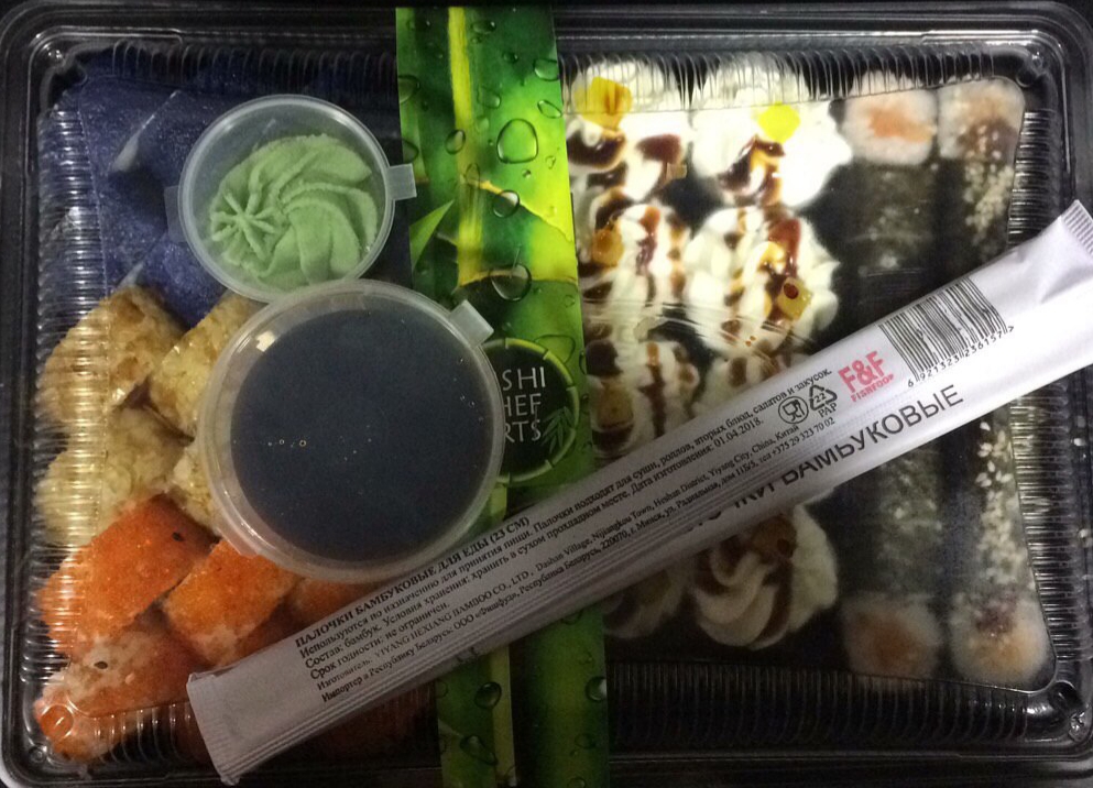 - На 1 суши-сет прилагается не более 4 комплектов палочек