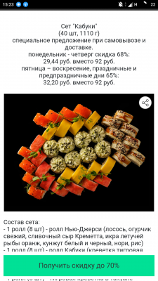 - Промокод дает право на скидку до 60% на суши-сеты от "ART FOOD"