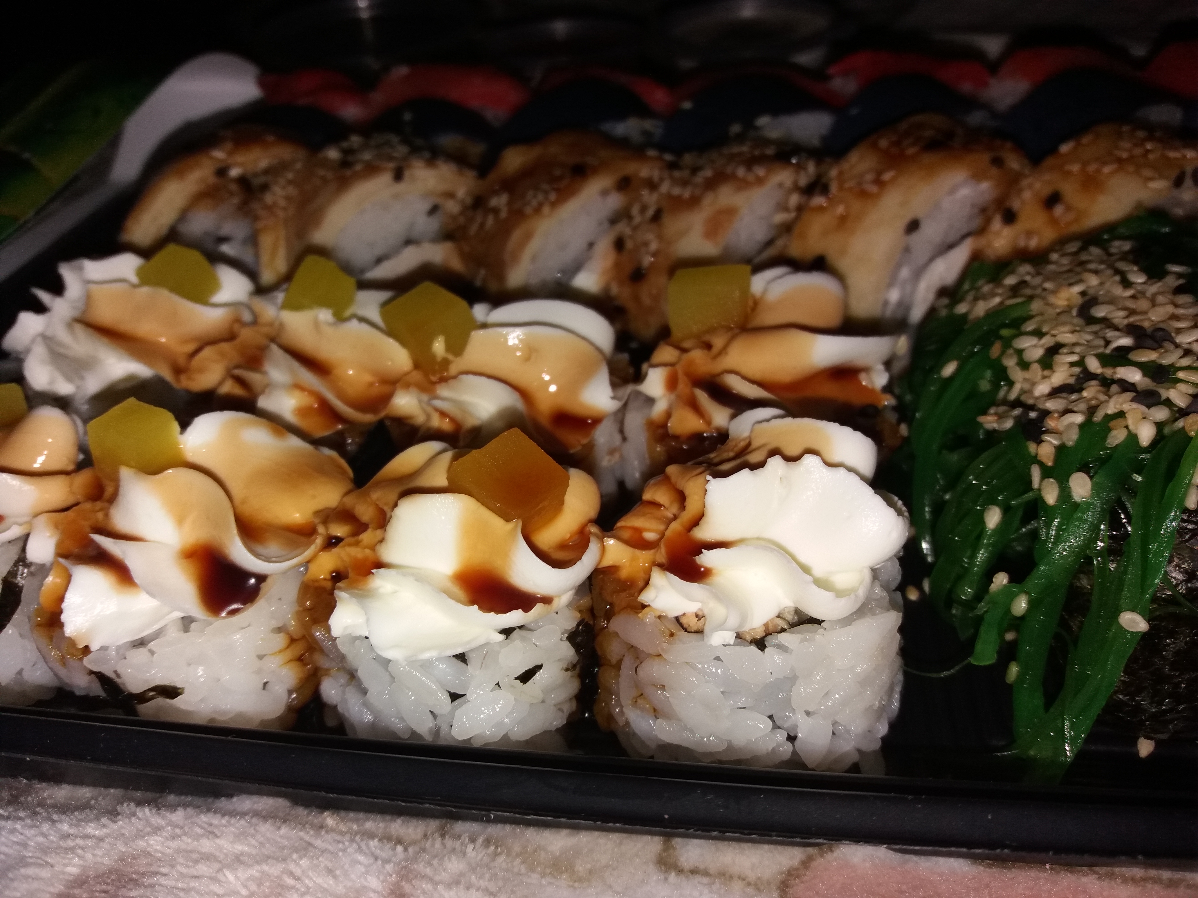 Все использованые продукты свежие, рис сварен отлично, но начинки пожалели. Было очень много сливочного сыра и совсем мало рыбы. Сегодня заказали еще, надеемся, что в этот раз все будет в норме.