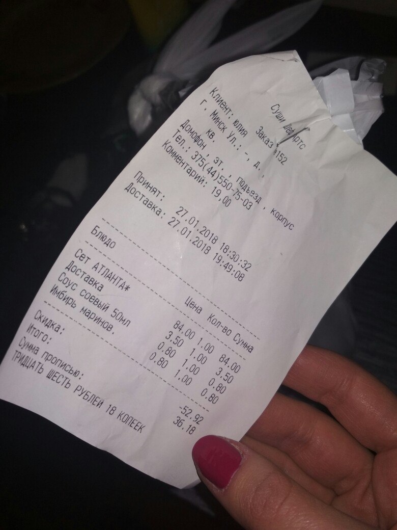 Сегодня с подругой заказали сет, но так как доставка была бы только после 22.00 суши решили забрать сами, по ул. Фрунзе. В итоге сет мы оплатили вместе с доставкой. Заметили только когда приехали домой. Пожалуйста, в следующий раз, будьте внимательнее с расчетами) А так все супер, суши вкусные как и всегда)