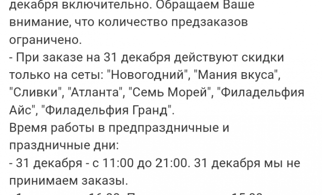 - Внимание! 31.12 приём заказов осуществляется с 10:00 до 20:00, ресторан работает с 11:00 до 20:30