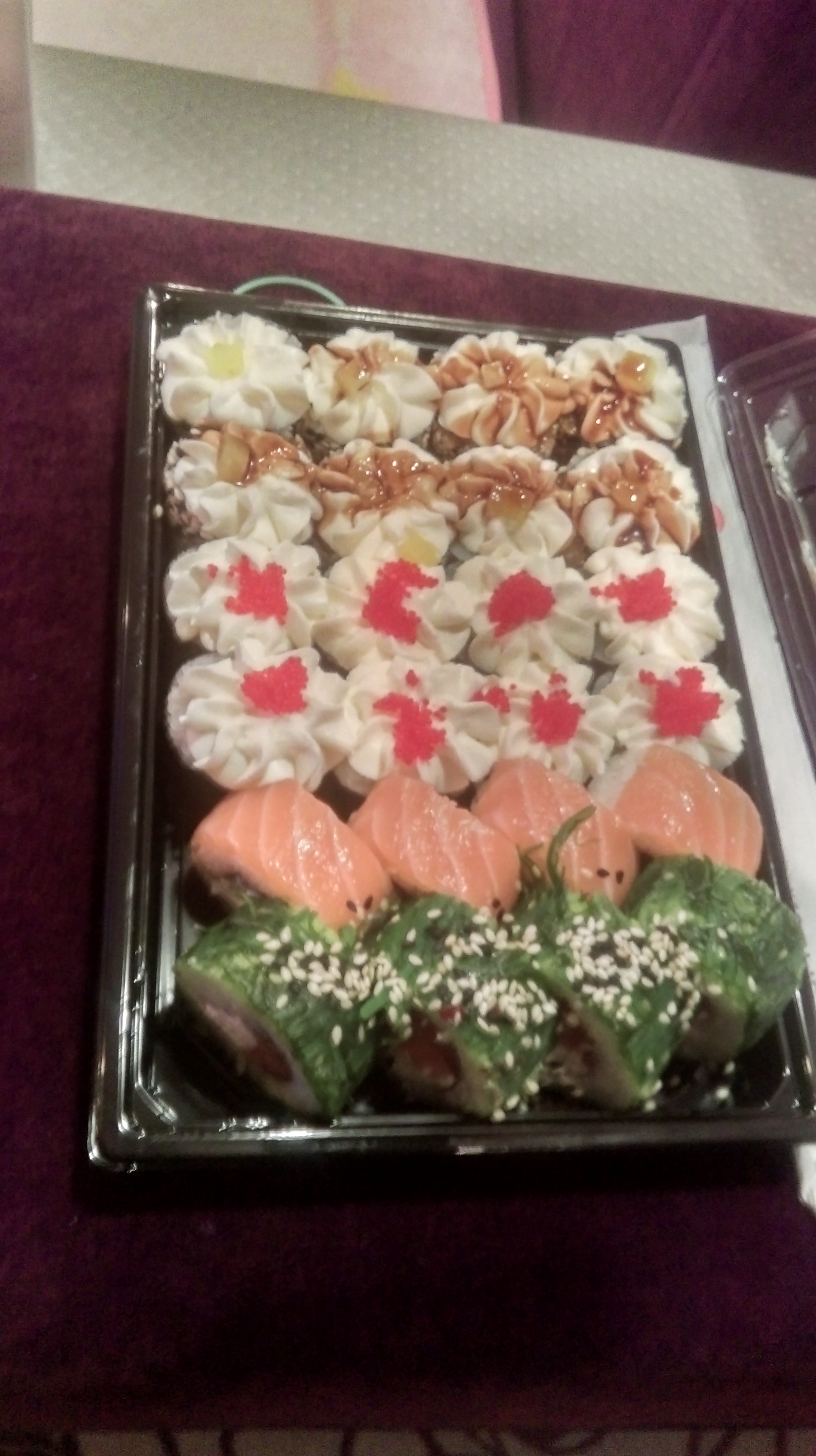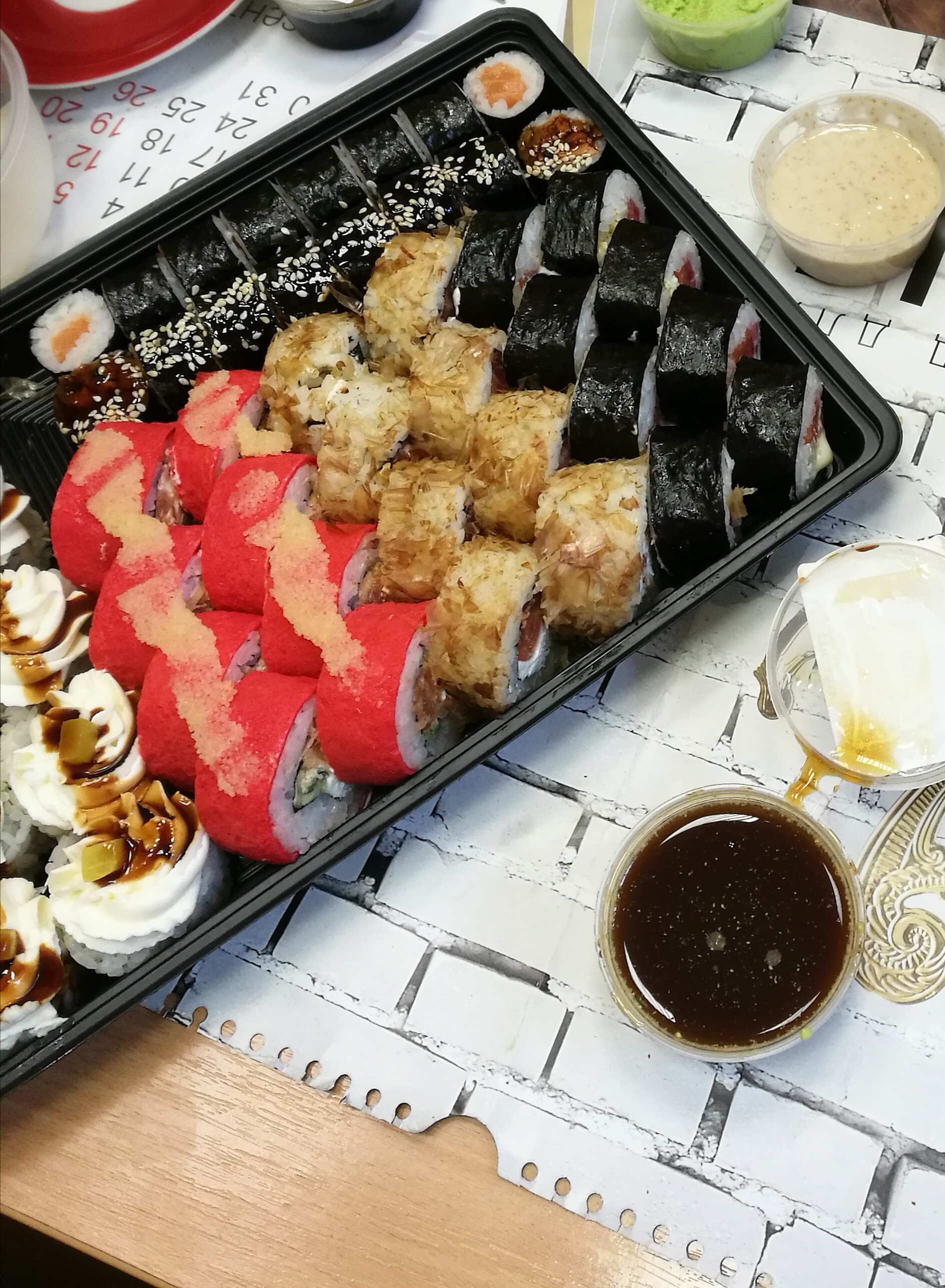 Очень вкусные суши!! Доставка, конечно, совсем не очень, опоздали на 40 минут!! И курьер даже не позвонил не предупредил, что задерживается. Было ощущение, что про нас просто забыли) Но такой неприятный момент компенсировали подарочком, курьер принес сок. Это было неожиданно, но молодцы, выкрутились из ситуации и сгладили неприятный осадок.