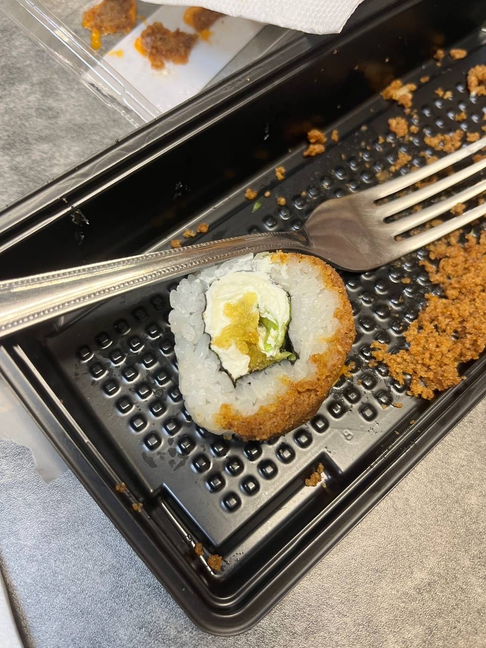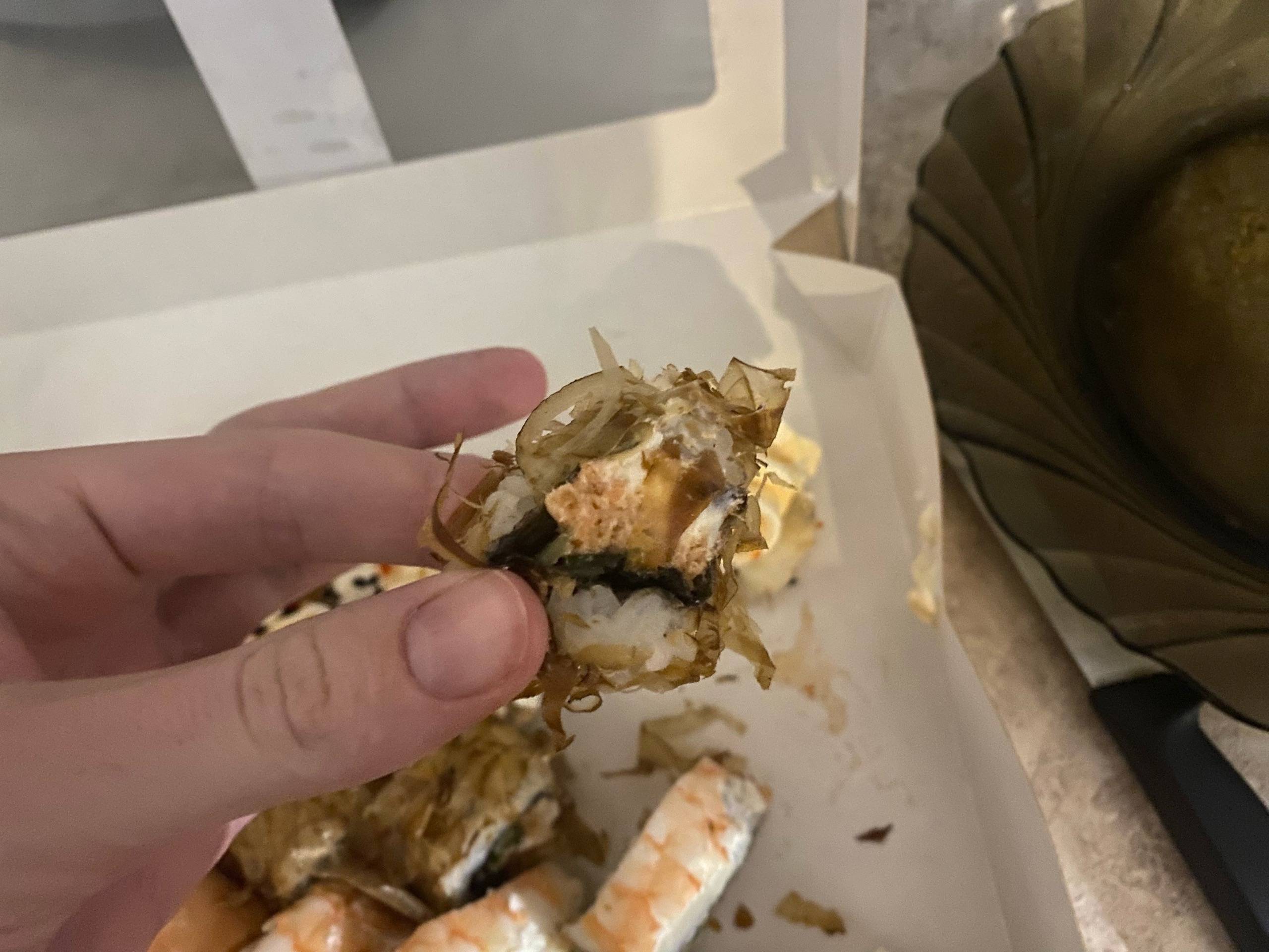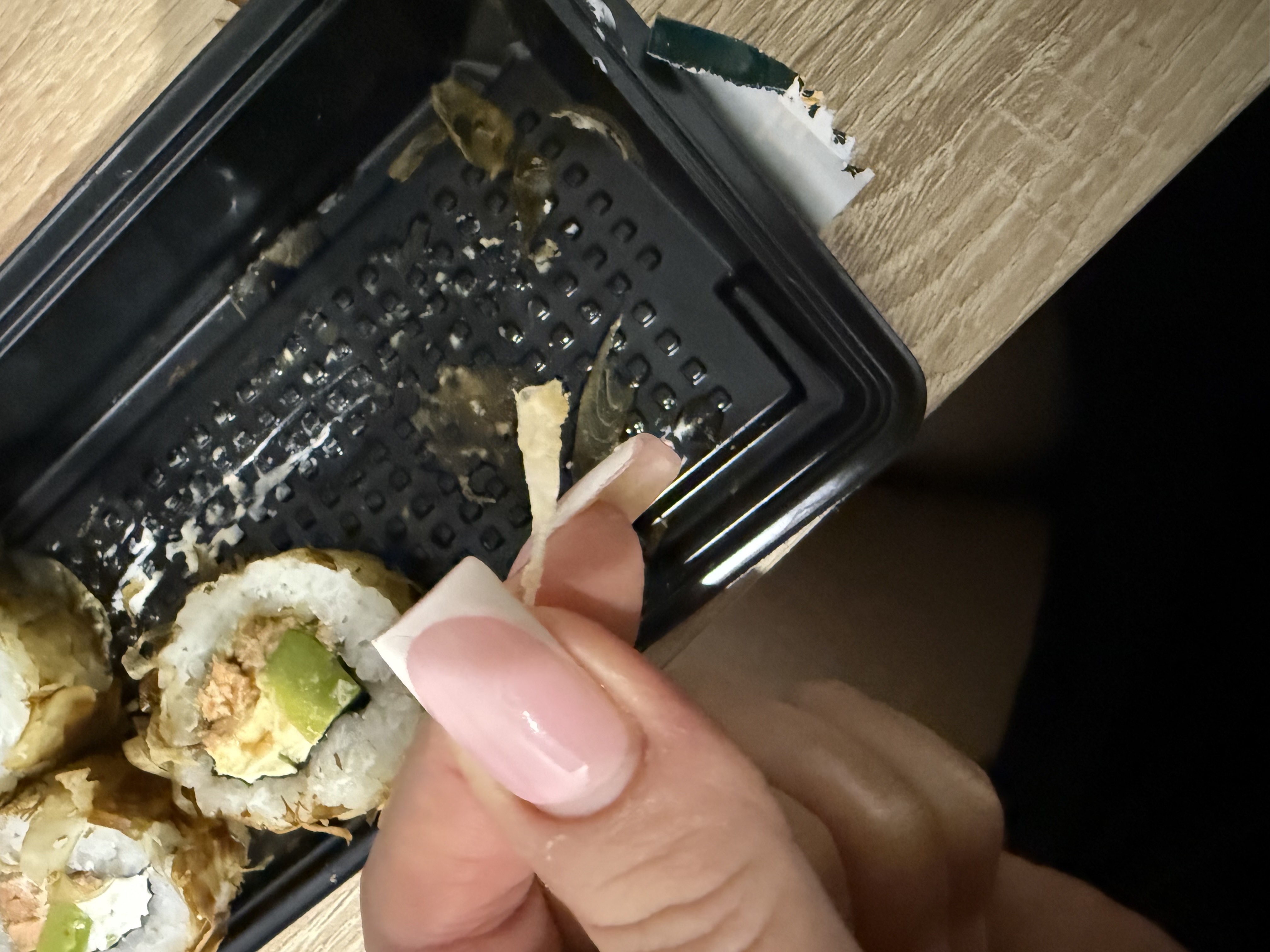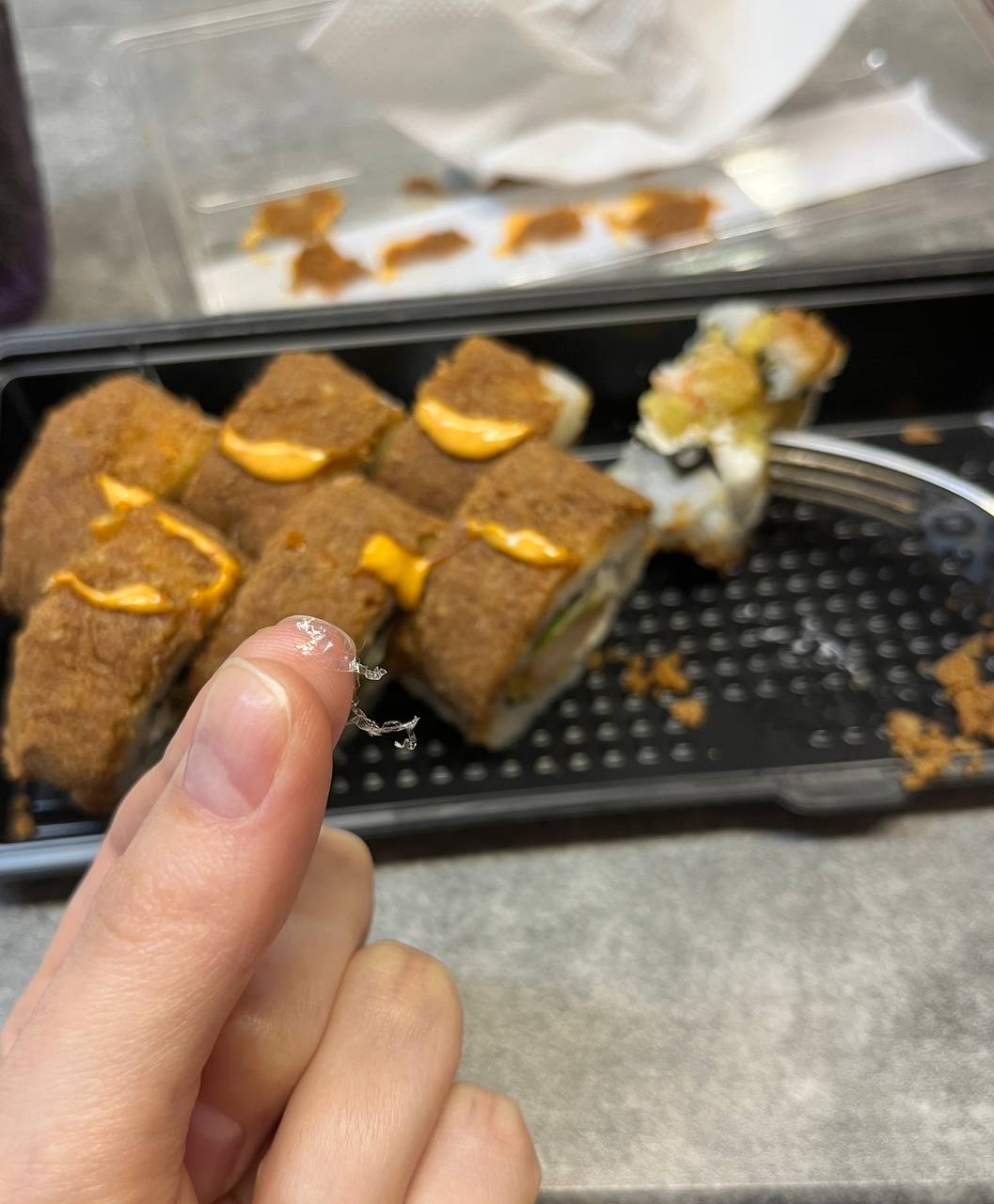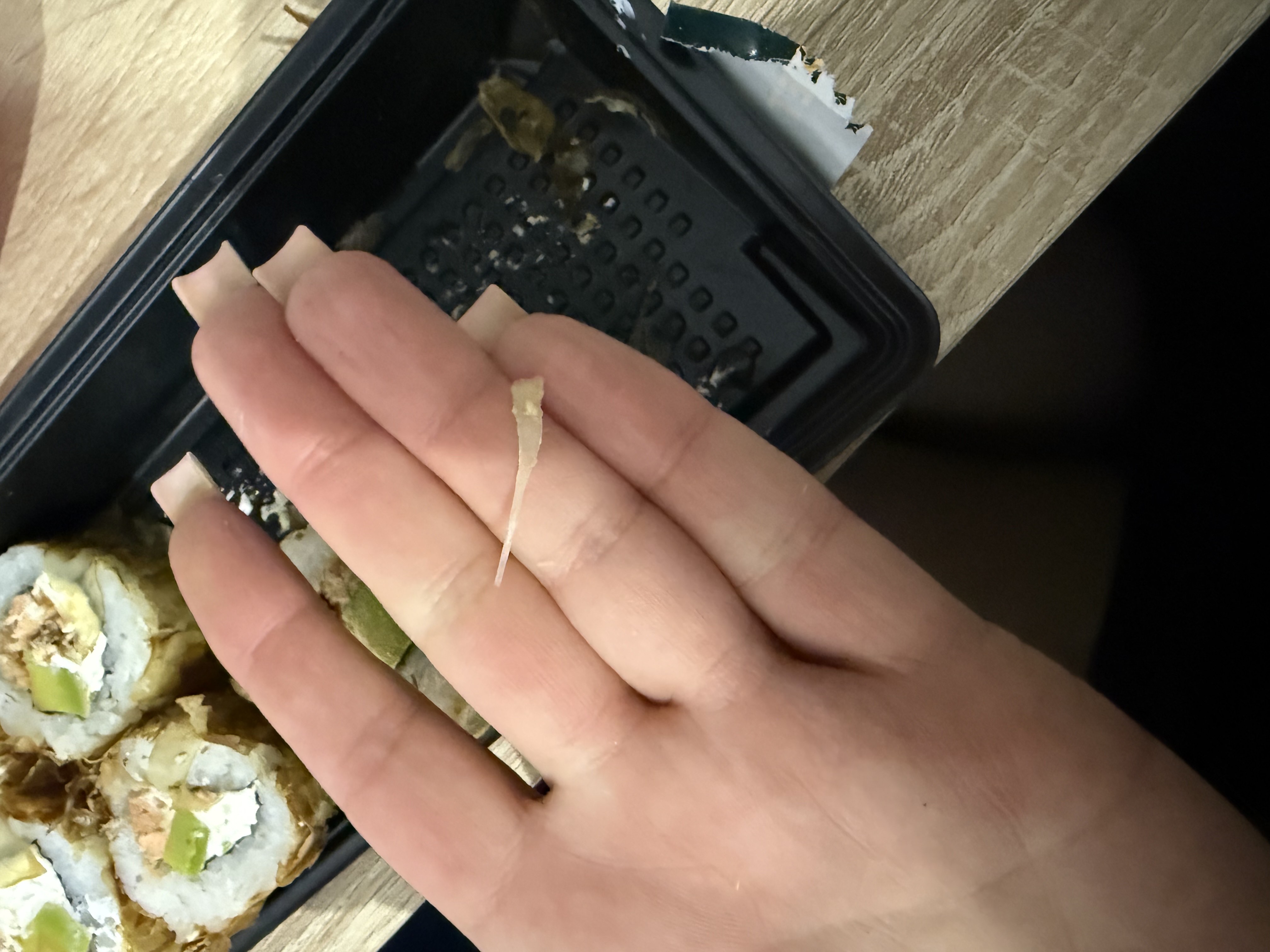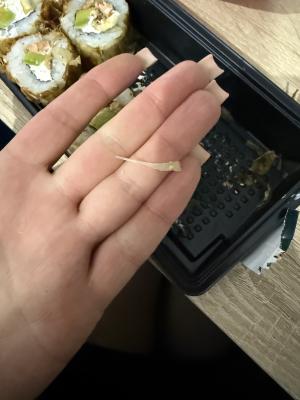 Вот такой сюрприз оказался в суши, хотя еда была вкусная , я извиняюсь , а как такая рыбная кость вообще туда попала ?