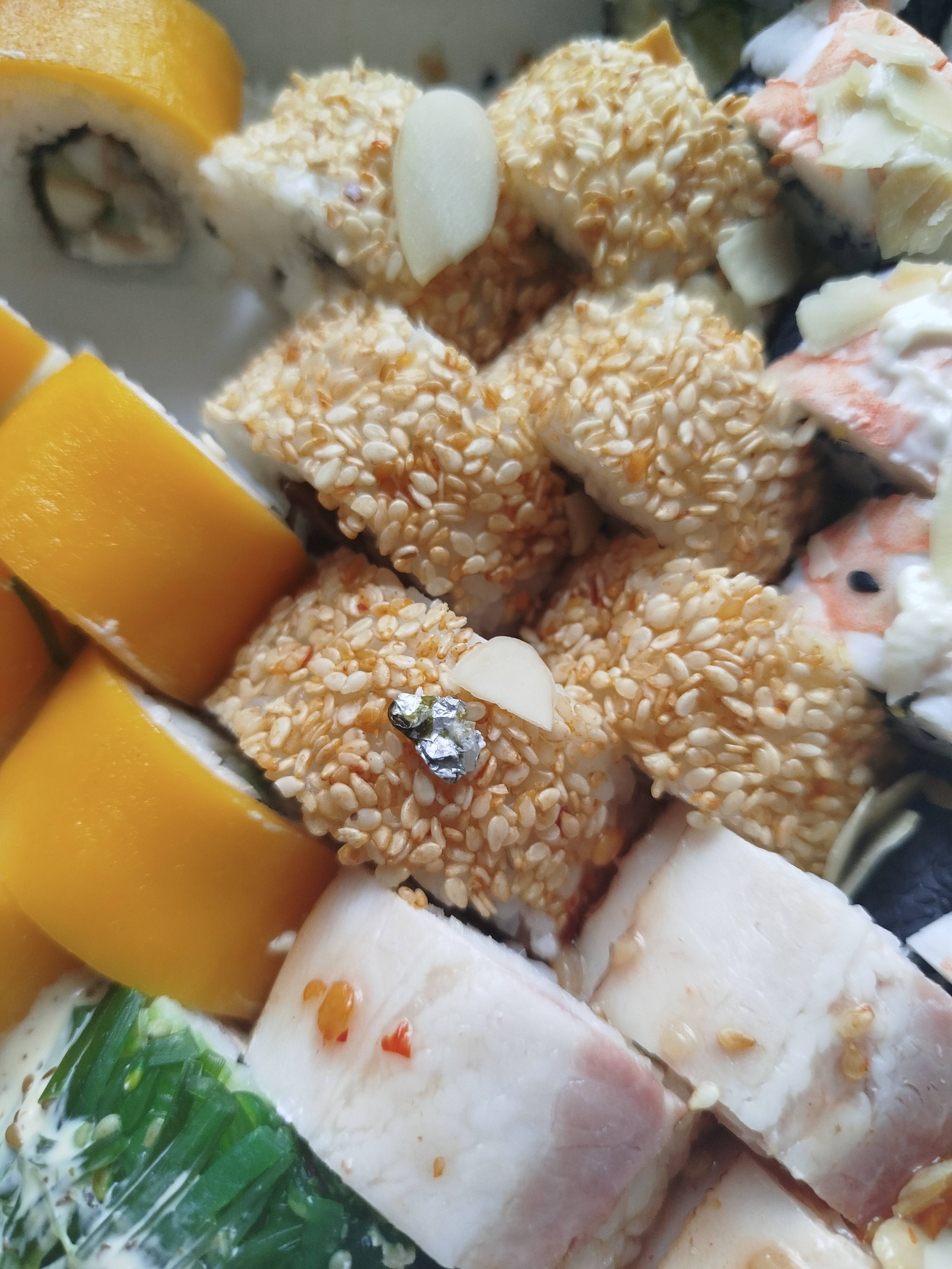 Добрый день,заказала сегодня роллы "офисный ФЭСТ Мега" роллы безумно вкусные,свежие всем рекомендую только к сожалению мне попался кусочек фольги от чего остался неприятный осадок😕(я не поняла как называеться этот ролл поэтому положила фольгу на тот рол в котором он был)