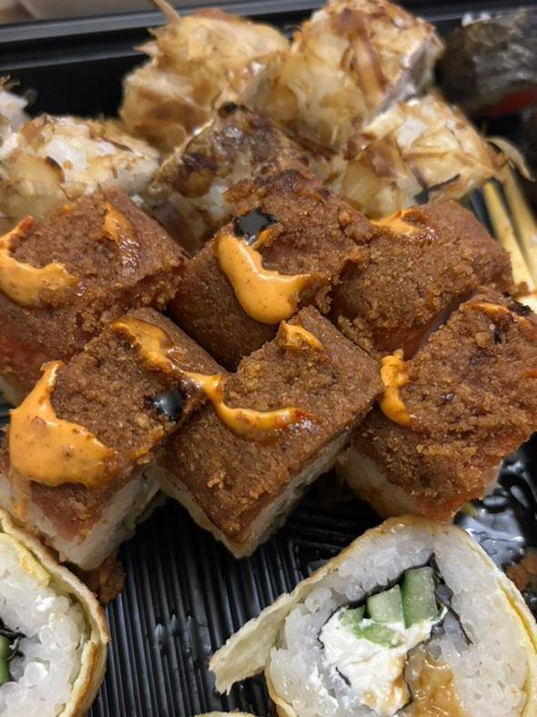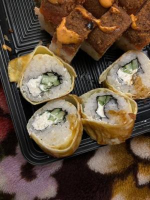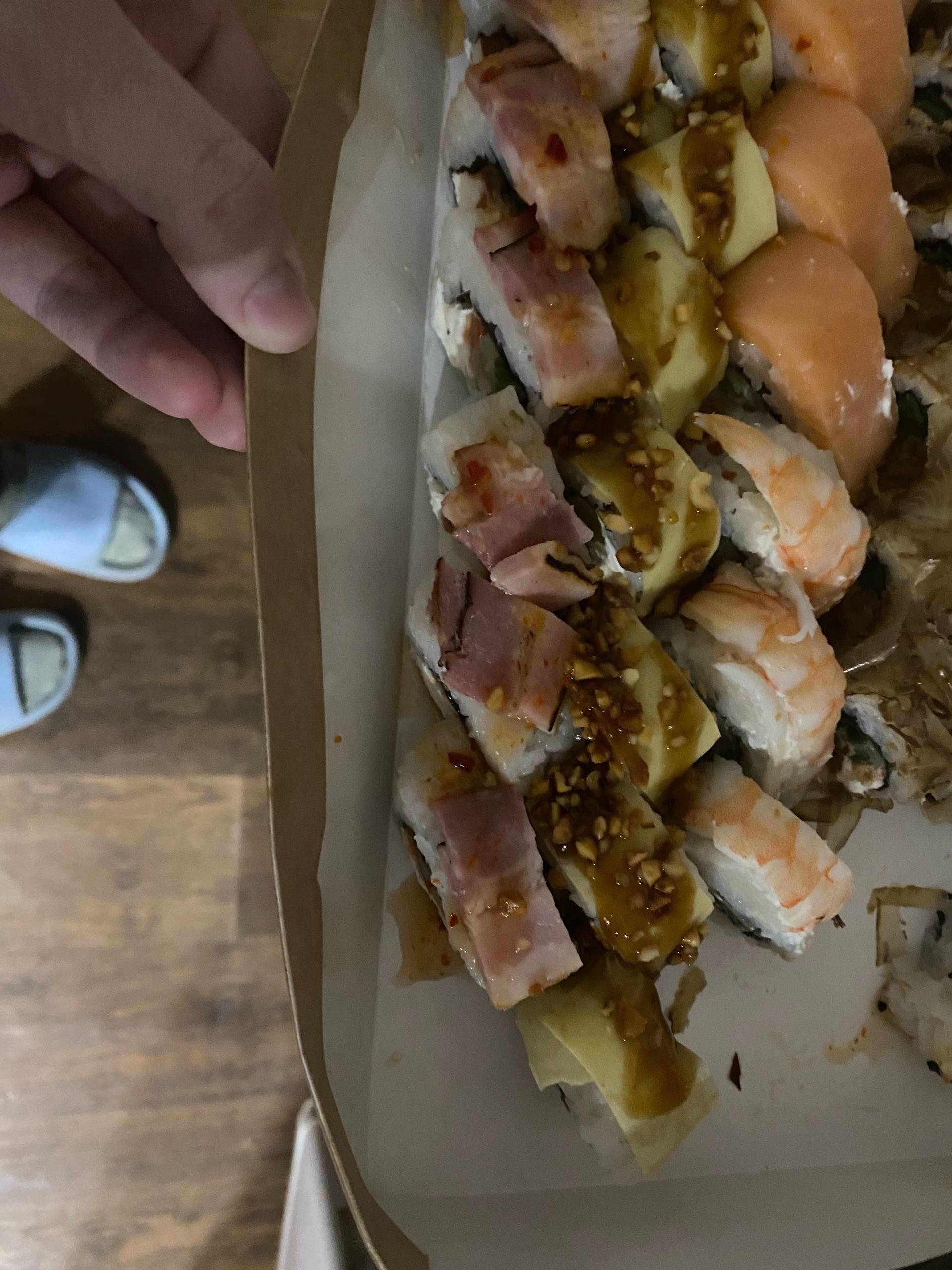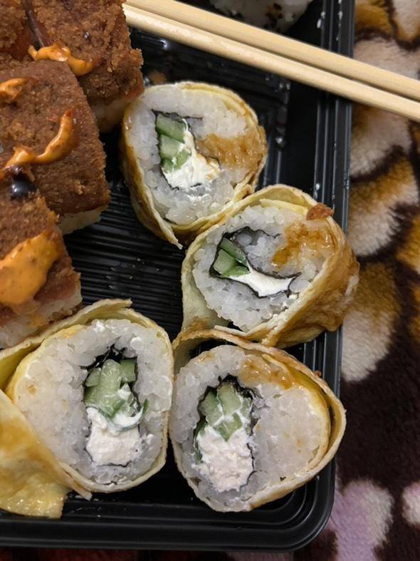 Суши ужасные на вкус, лосося в Филадельфии тоненький кусочек. Начинки хорошо если 1/4 часть от всего ролла. Рис как будто бы семейный из короны, на вкус пресный.