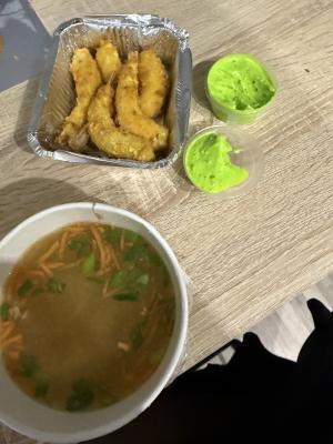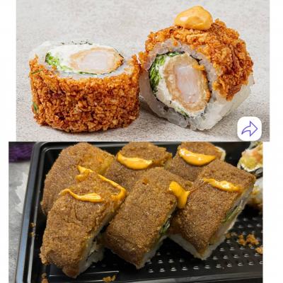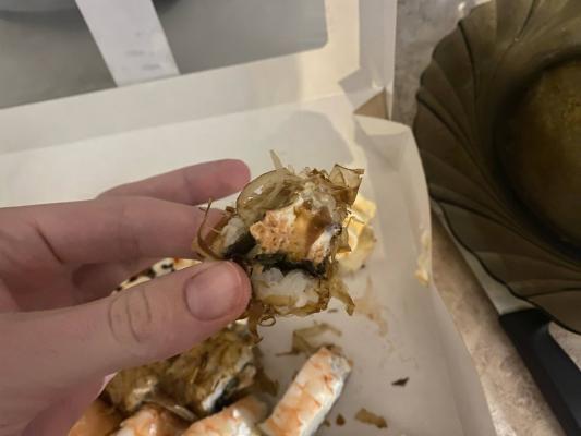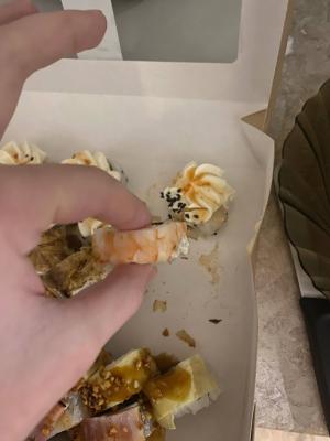 Какая-та непонятная подгоревшая панировка, в нескольких вообще креветок не было, ну и бонусом положили кусок целованного пакета, спасибо!
