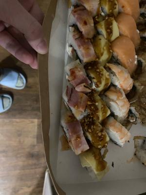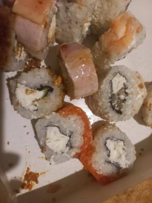 Заказывал раз 40 у вас суши,всё было вкусно ,но это было в районе каменки или самовызов с Алми на притыцкого .Сейчас второй раз заказал в октяборьский район сет "Смоки" .Это ужасно ,делали наверное в другой точке и в ролл с омлетом не положили ни одной креветки,тоесть в сете за 51р я должен есть огурец с рисом и сыром в яйце. Про другой острый вкусный (когда-то был) ролл я лучше промолчу,в этот раз на нём была какая-то слепленная каша с солью