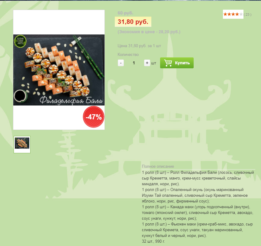 - Внимание! К предзаказу на 31.12 доступны: сет "Новогодний", "Мамины радости", "Макеба", "Ясахи", "Филадельфия", "Каприз", "Игра в кальмара", "Можно всё!", "Мама босс", "Палитра вкуса", "Муж купил", "Биг босс", "Мафия", "Манга", роллы Урамаки, все напитки и гарниры