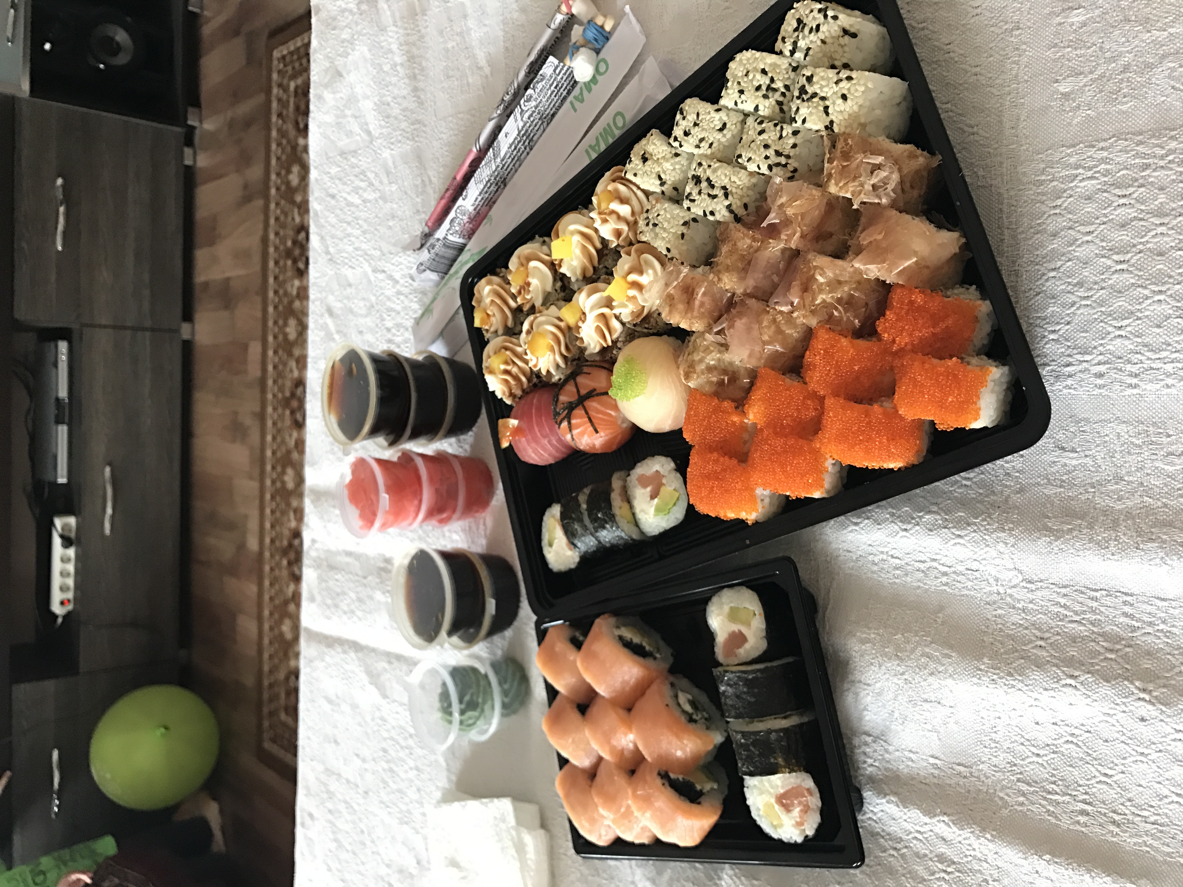 - На 1 суши-сет прилагается не более 4 комплектов палочек