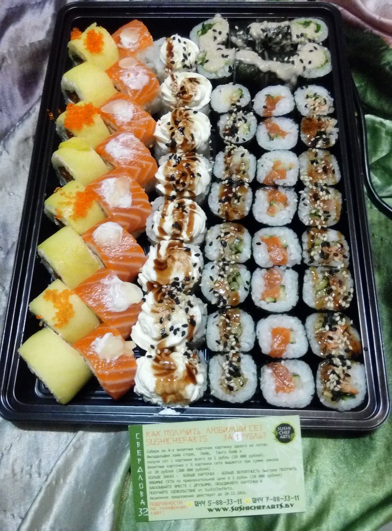 - Промокод дает право на скидку до 60% на суши-сеты от "ART FOOD"