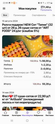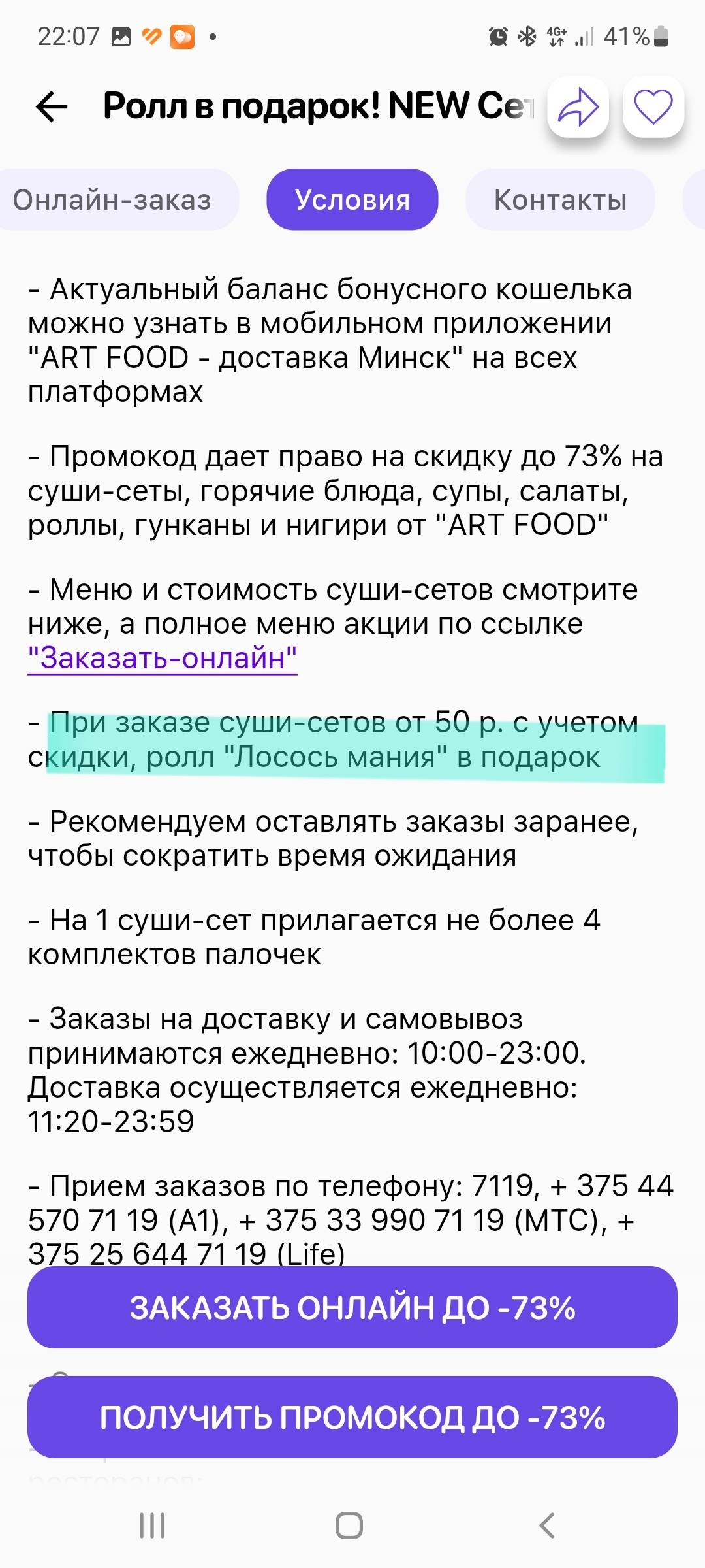 - Промокод дает право на скидку до 60% на суши-сеты от "ART FOOD"