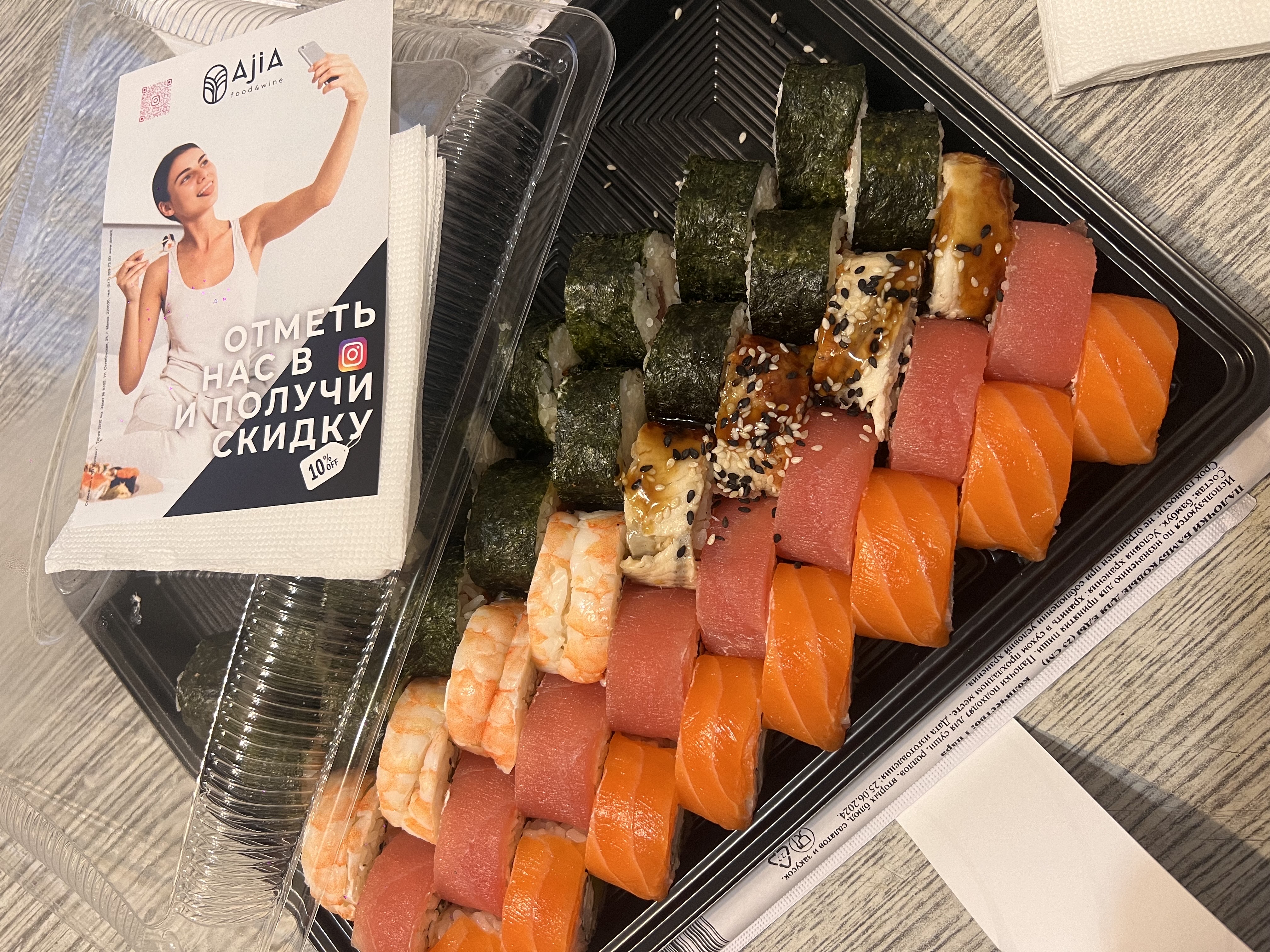 - Промокод также дает право на скидку до 46% на нигири и роллы от бара и доставки суши "AjiA"
