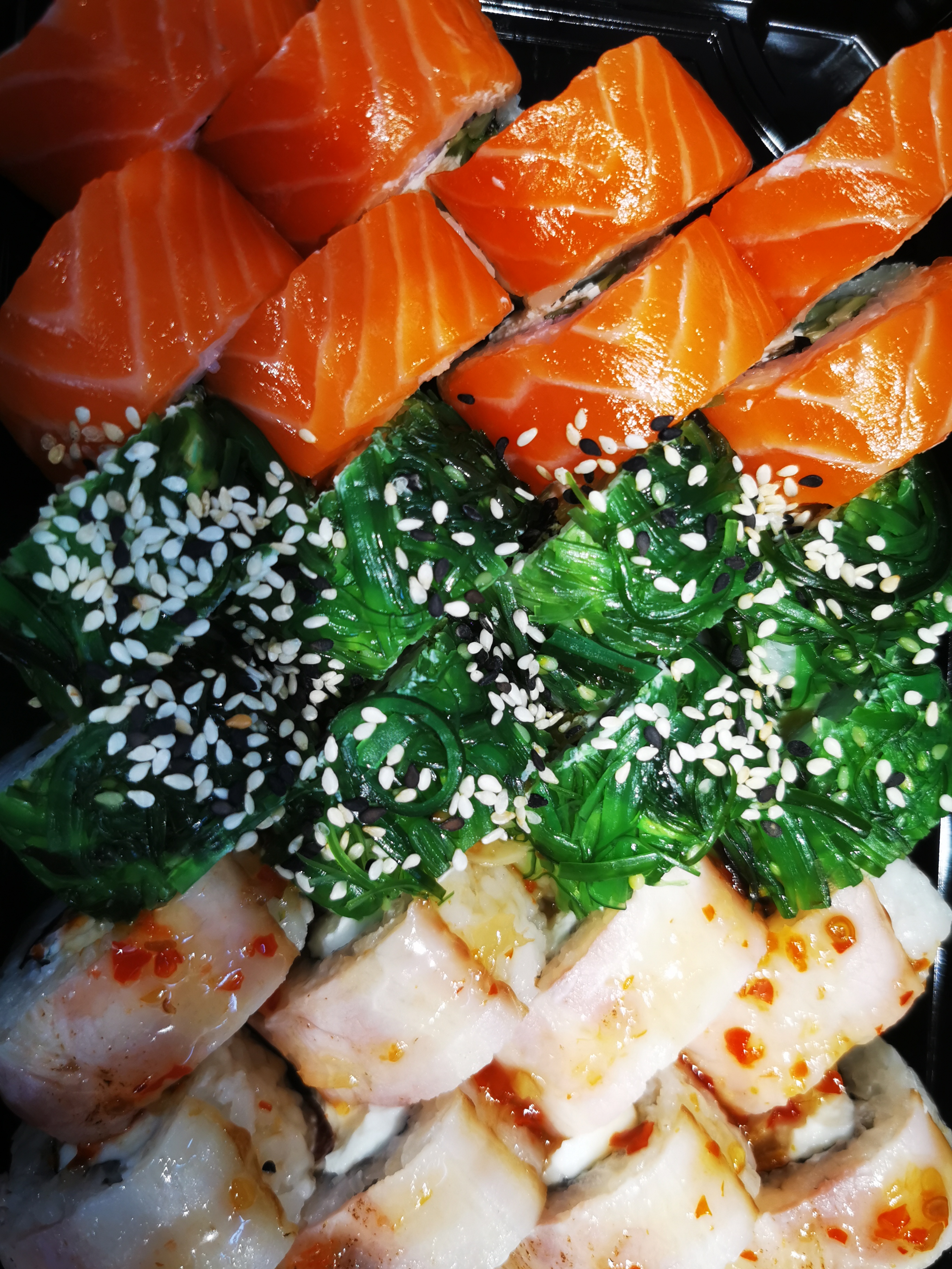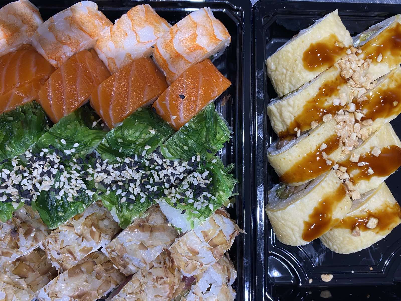 Состав: филе лосося, угорь, креветка тигровая, авокадо, огурец, сыр, рис, нори