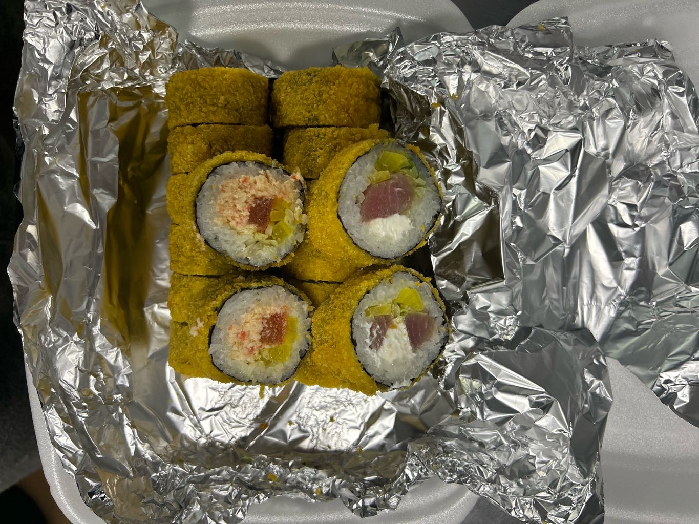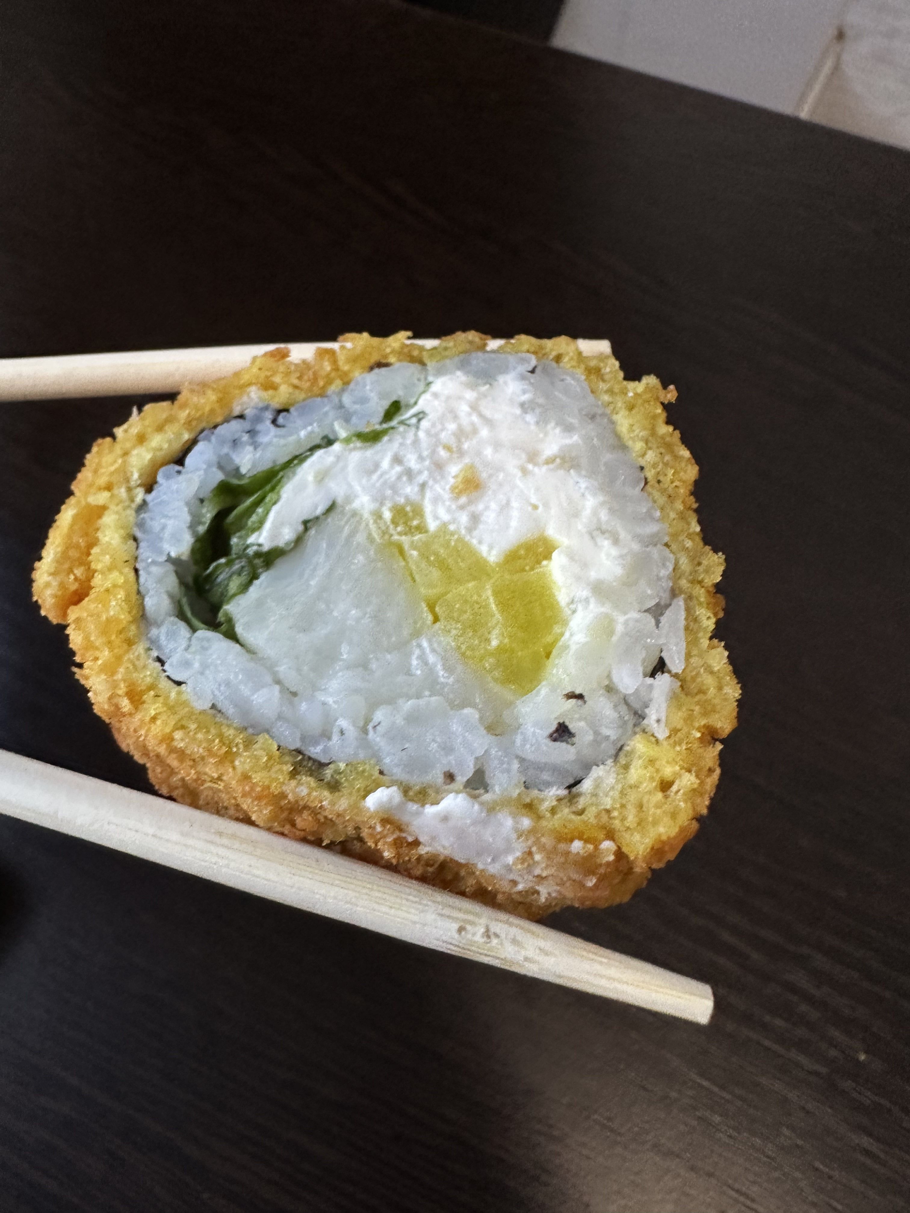 Состав: тунец, такуан, сыр, нори, рис, темпура
