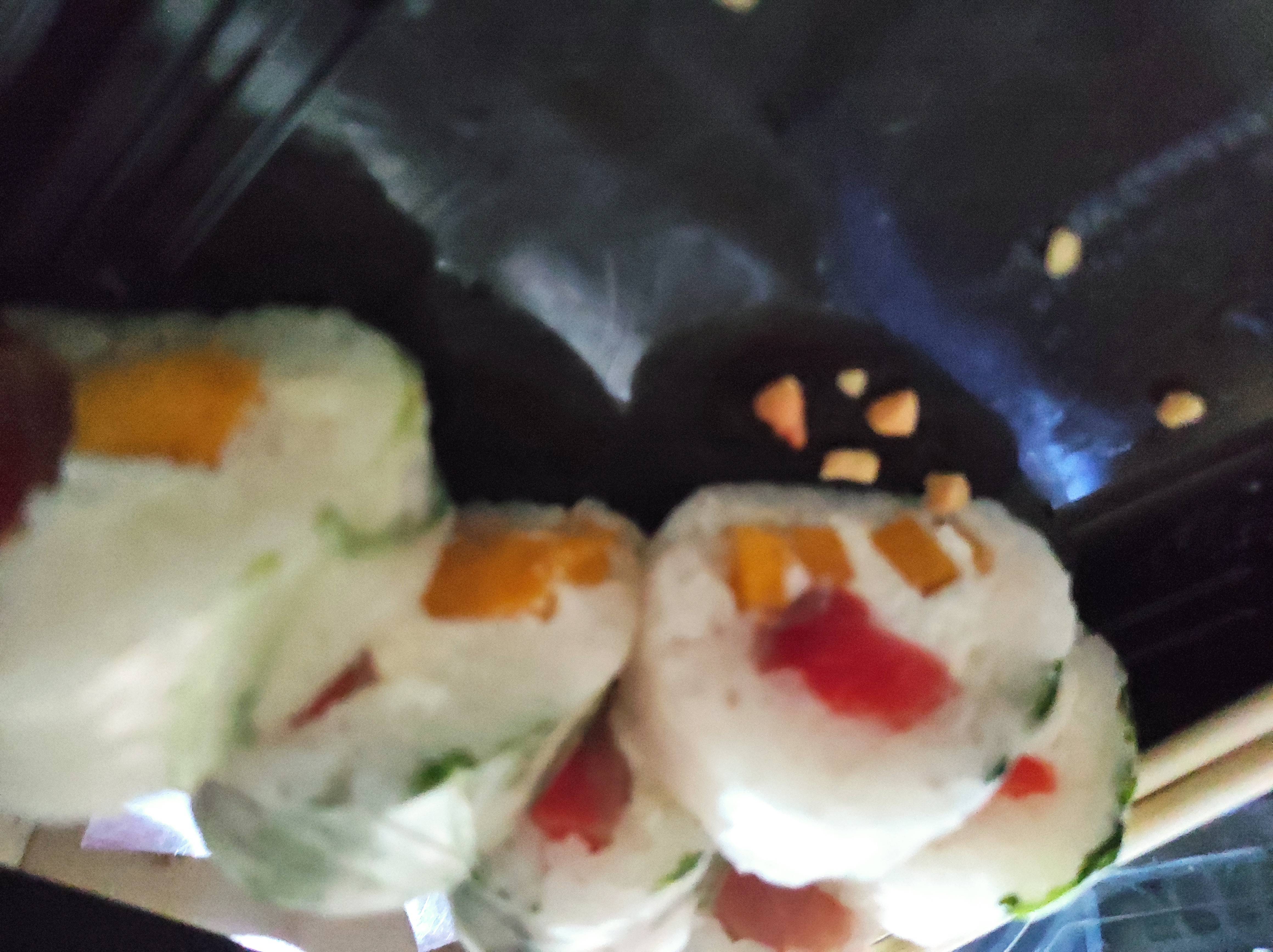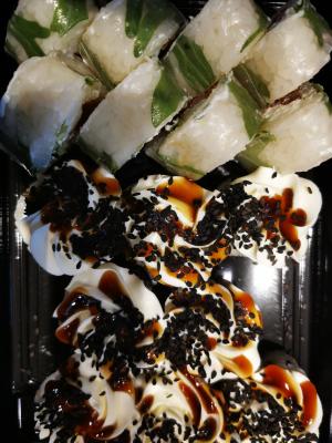 - ролл "Крем-шитаке в японском блинчике": грибы шиитаке, обжаренные в соусе терияки, крем-чиз, японский блинчик оранж, такуан, соус терияки, арахис, нори, рис - 8 шт.
