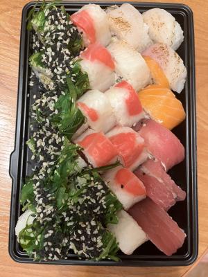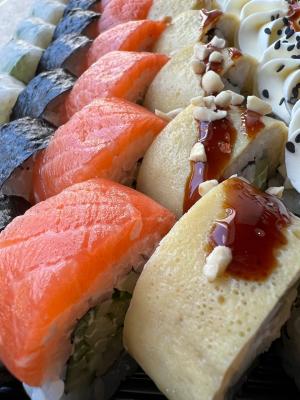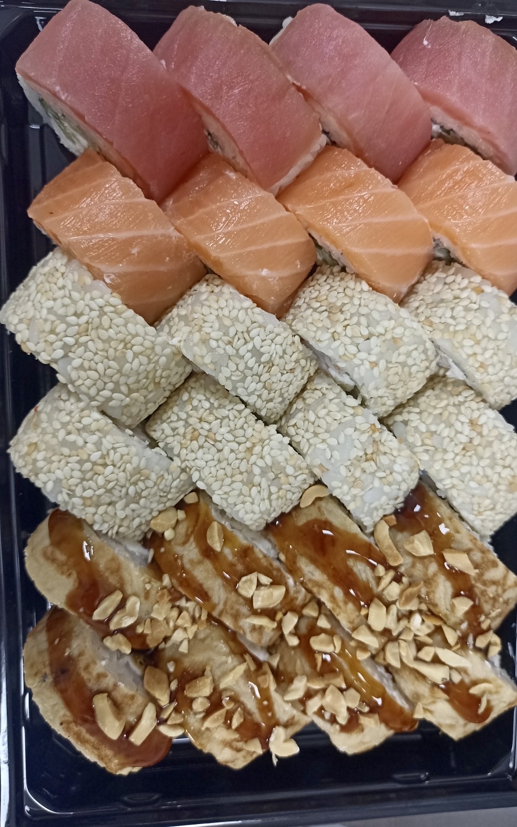 Состав: филе лосося, угорь, креветка тигровая, авокадо, огурец, сыр, рис, нори