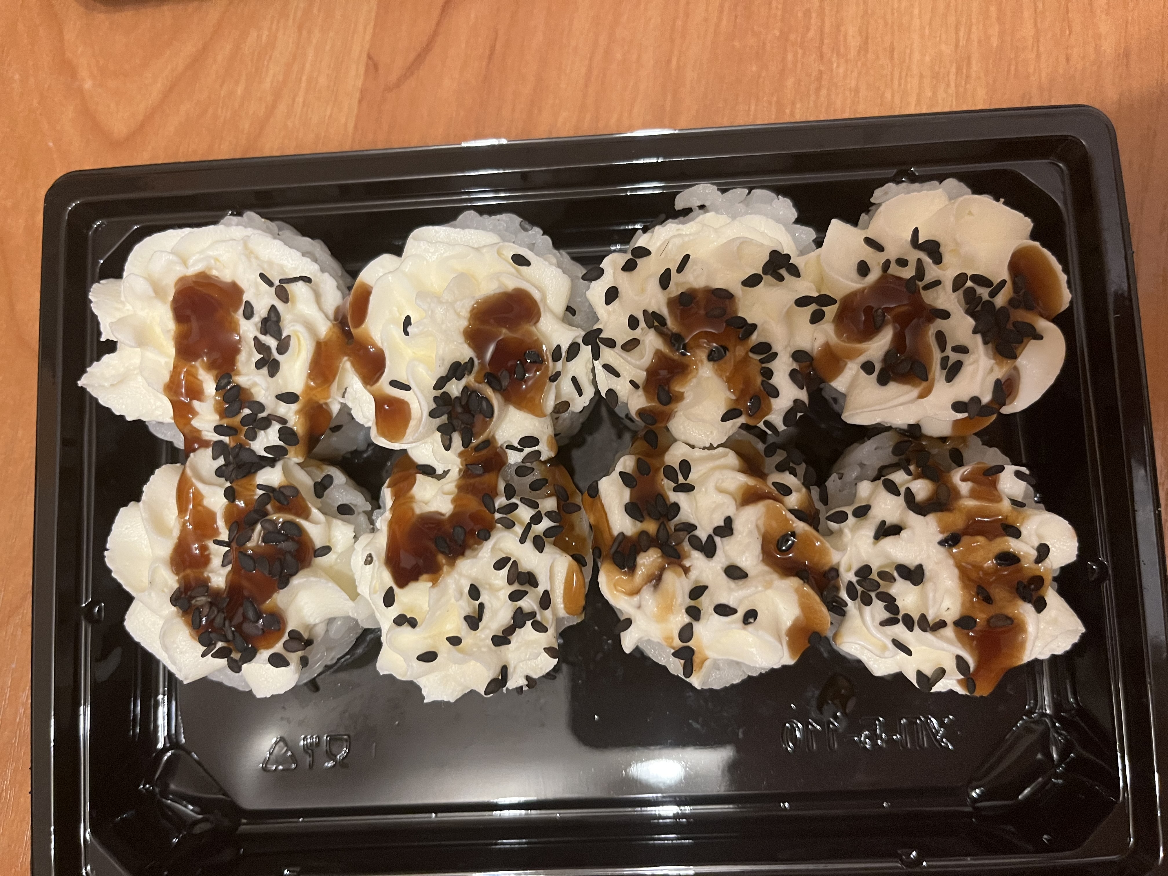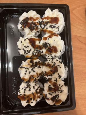 - ролл "Мидии терияки под сырной шапочкой": мидии, морковь терияки, кунжут, крем-сыр, соус терияки, нори, рис - 8 шт.