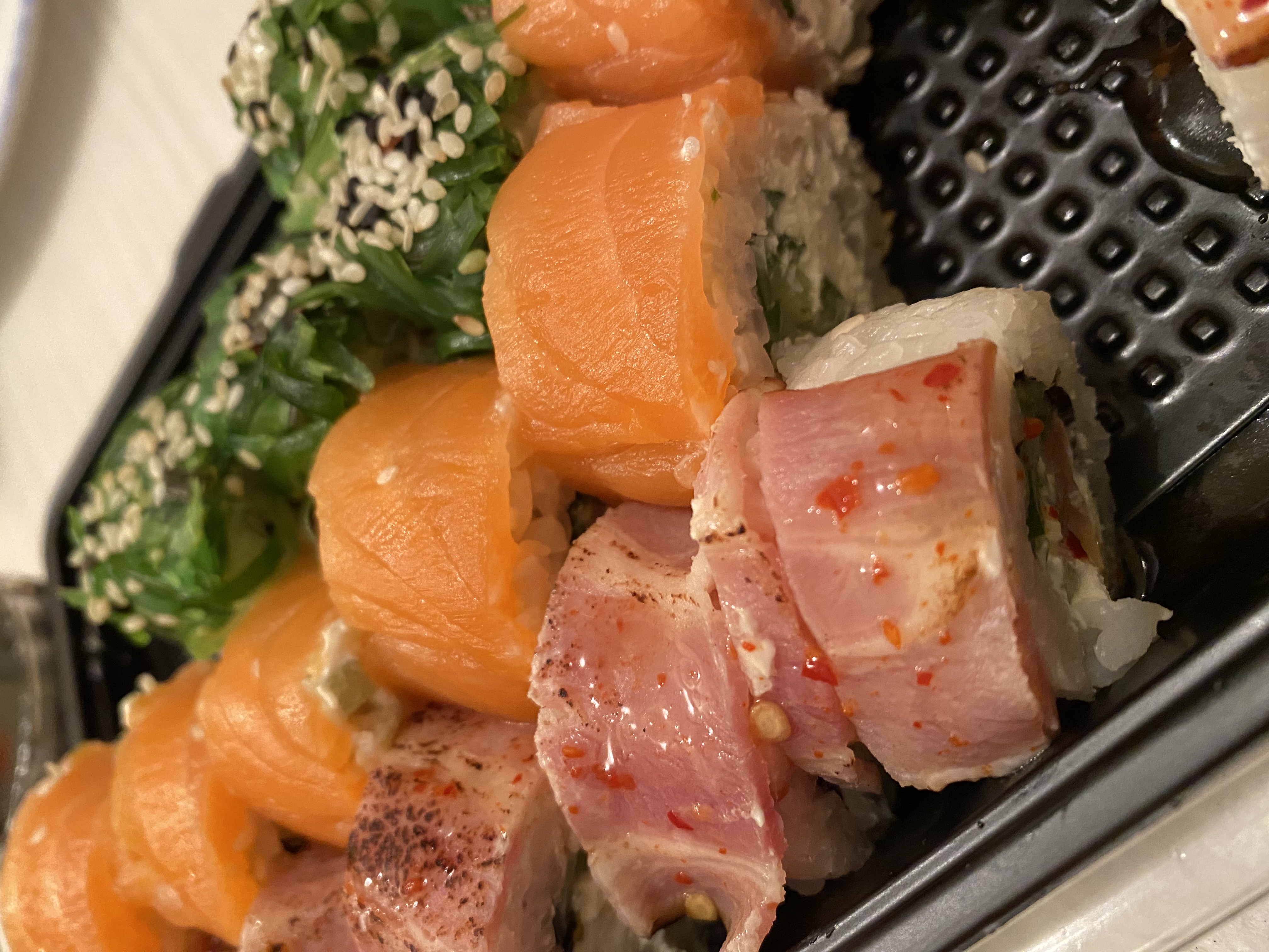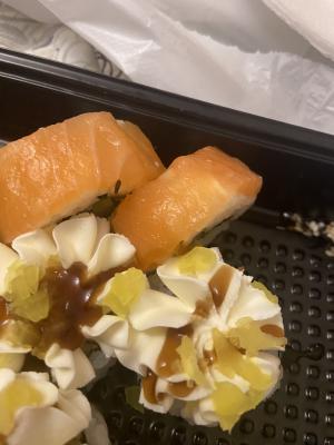 Состав: тунец, такуан, сыр, нори, рис, темпура