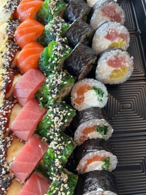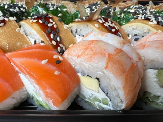 Состав: филе лосося, угорь, креветка тигровая, авокадо, огурец, сыр, рис, нори