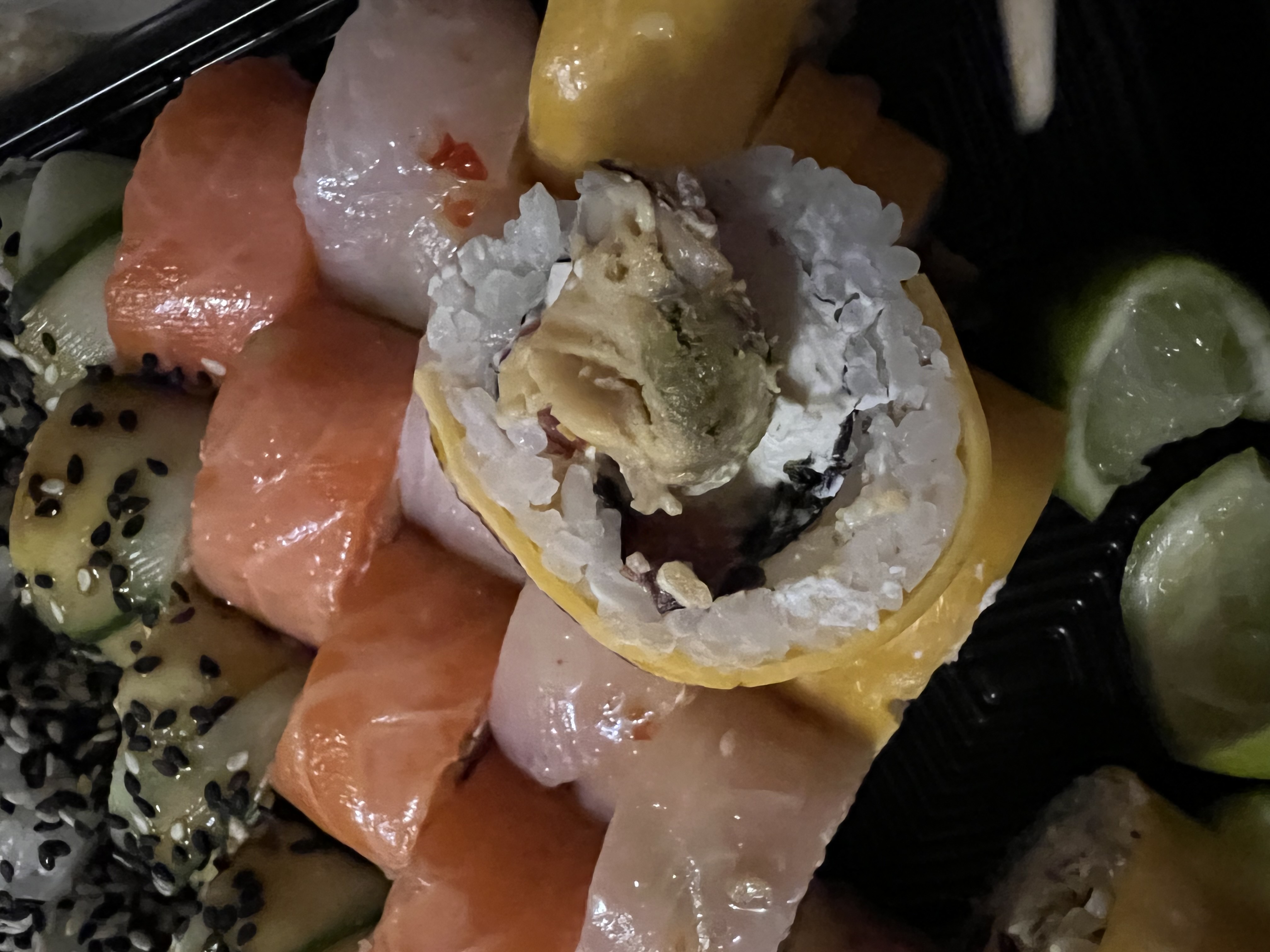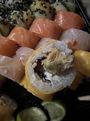 Состав: филе лосося, угорь, креветка тигровая, авокадо, огурец, сыр, рис, нори